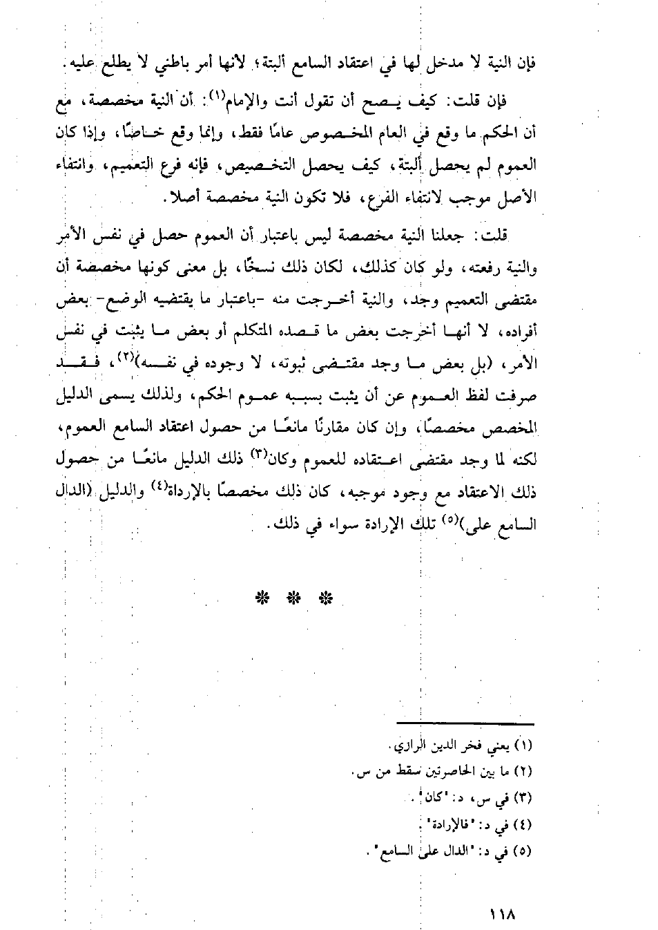 قلت: جعلنا النية مخصصة ليس باعتبار أن العموم حصل في نفس الأمر والنية رفعته، ولو كان كذلك، لكان ذلك نسخًا، بل معنى كونها مخصصة أن مقتضى التعميم وجد، والنية أخرجت منه- باعتبار ما يقتضيه الوضع- بعض أفراده، لا أنها أخرجت بعض ما قصده المتكلم أو بعض ما يثبت في نفس الأمر، (بل بعض ما وجد مقتضي ثبوته، لا وجوده في نفسه)، فقد صرفت لفظ العموم عن أن يثبت بسببه عموم الحكم، ولذلك يسمى الدليل المخصص مخصصًا، وإن كان مقارنًا مانعًا من حصول اعتقاد السامع العموم، لكنه لما وجد مقتضى اعتقاده للعموم وكان ذلك الدليل مانعًا من حصول ذلك الاعتقاد مع وجود موجبه، كان ذلك مخصصًا بالإرادة والدليل (الدال السامع على) تلك الإرادة سواء في ذلك.