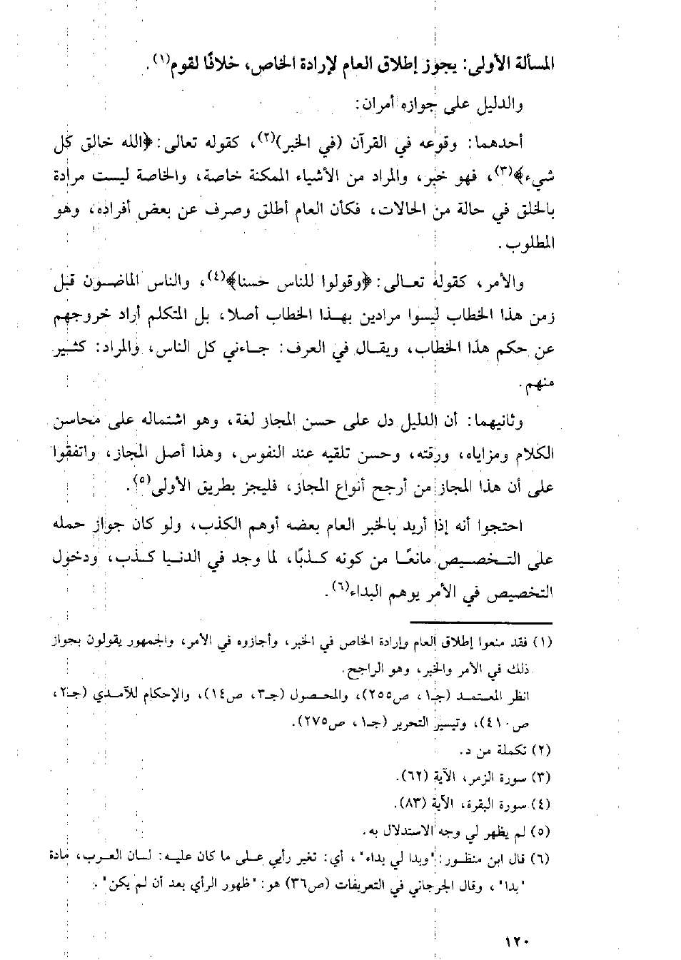 المسألة الأولى: يجوز إطلاق العام لإرادة الخاص، خلافًا لقول.