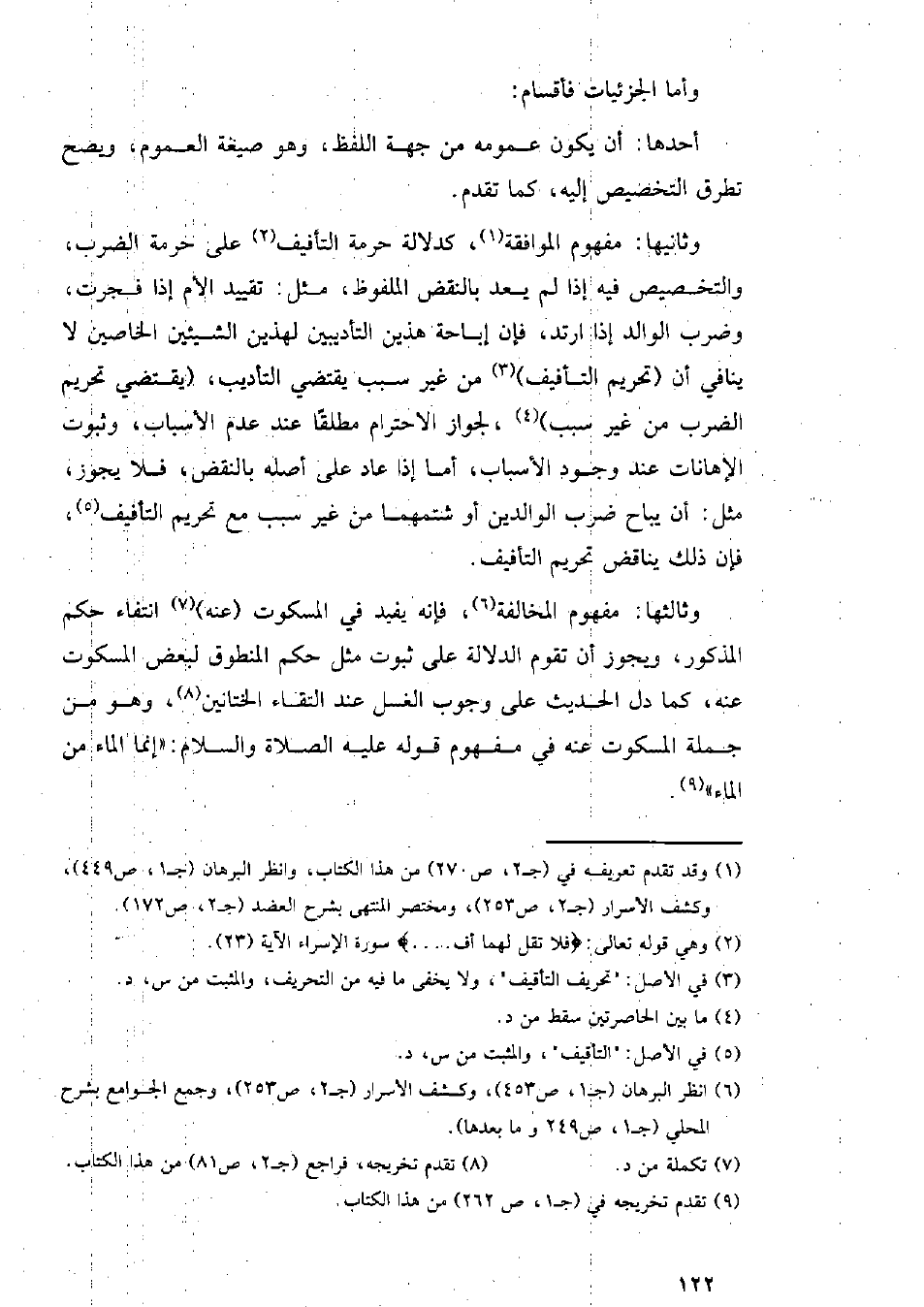 وثانيها: مفهوم الموافقة، كدلالة حرة التأفيف على حرمة الضرب، والتخصيص فيه إذا لم يعد بالنقض الملفوظ، مثل: تقييد الأم إذا فجرت، وضرب الوالد إذا ارتد، فإن إباحة هذين التأديبين لهذين الشيئين الخاصين لا ينافي أن (تحريم التأفيف) من غير سبب يقتضي التأديب، (يقتضي تحريم الضرب من غير سبب)، لجواز الاحترام مطلقًا عند عدم الأسباب، وثبوت الإهانات عند وجود الأسباب، أما إذا عاد على أصله بالنقض، فلا يجوز، مثل: أن يباح ضرب الوالدين أو شتمهما من غير سبب مع تحريم التأفيف، فإن ذلك يناقض تحريم التأفيف.