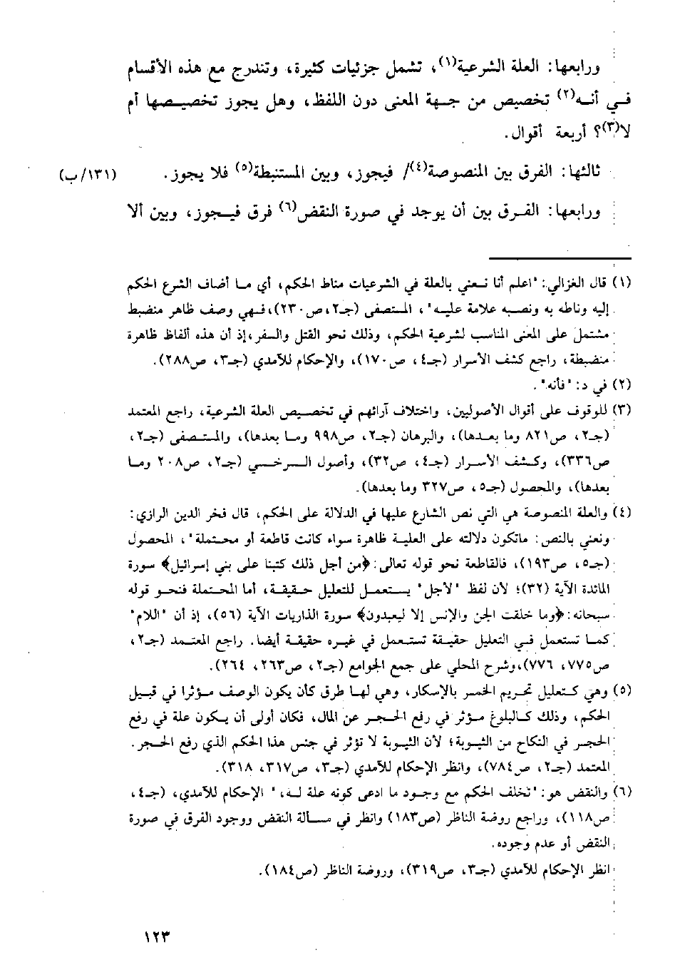 ورابعها: العلة الشرعية، تشمل جزئيات كثيرة، وتندرج مع هذه الأقسام في أنه تخصيص من جهة المعنى دون اللفظ، وهل يجوز تخصيصها أم لا؟ أربعة أقوال.
