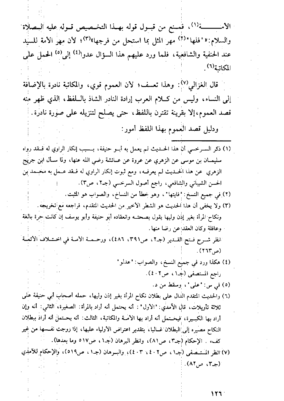 قال الغزالي: وهذا تعسف؛ لأن العموم قوي، والمكاتبة نادرة بالإضافة إلى النساء، وليس من كلام العرب إرادة النادر الشاذ باللفظ، الذي ظهر منه قصد العموم، إلا بقرينة تقترن باللفظ، حتى يصلح لتنزيله على صورة نادرة.