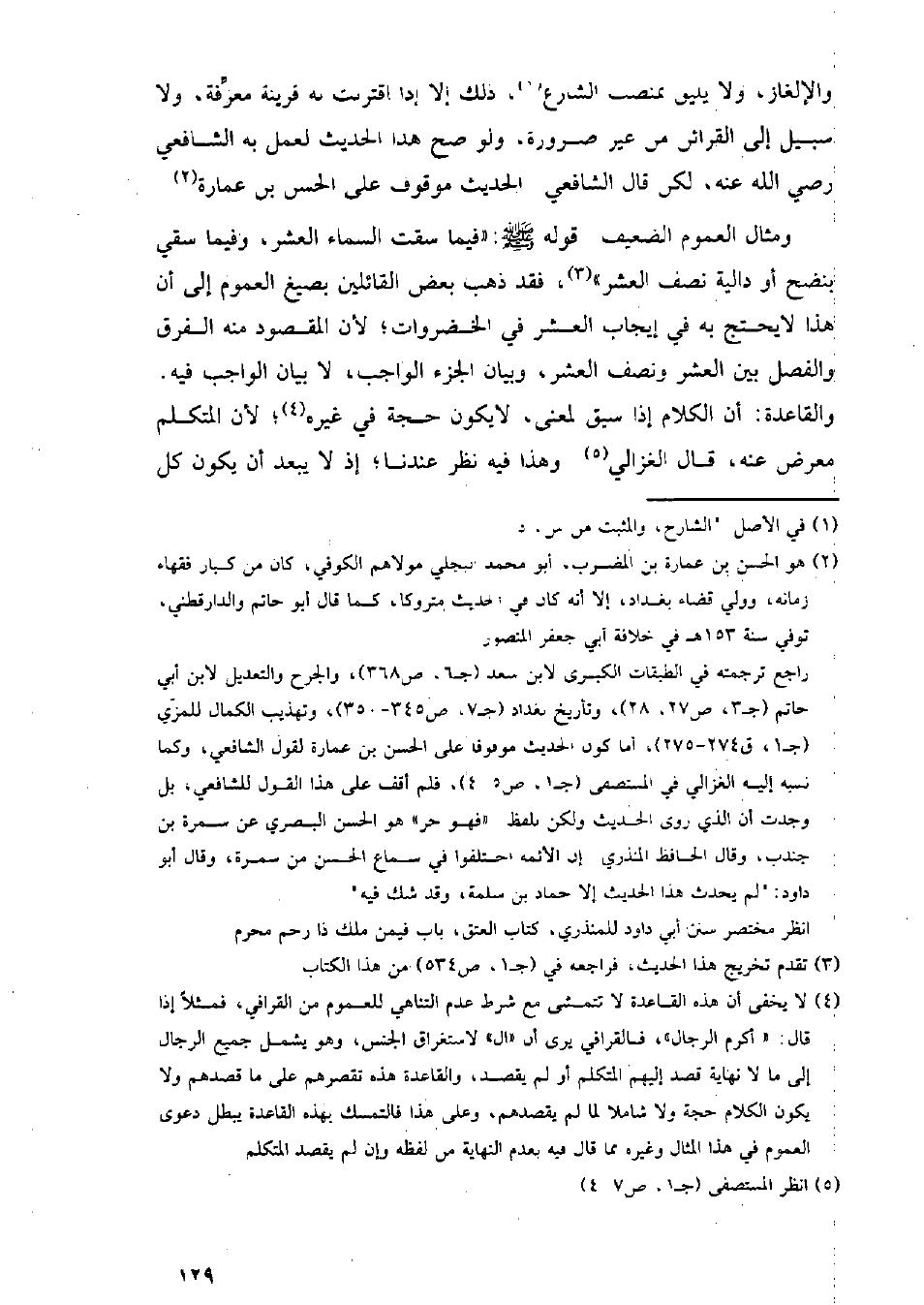 والإلغاز، ولا يليق بمنصب الشارع، ذلك إلا إذا اقتربت به قرينة معرفة، ولا سبيل إلى القرائن من غير ضرورة، ولو صح هذا الحديث لعمل به الشافعي رضي الله عنه، لكن قال الشافعي الحديث موقوف على الحسن بن عمارة ومثال العموم الضعيف قوله - صلى الله عليه وسلم -: "فيما سقت السماء العشر، وفيما سقي بنضح أو دالية نصف العشر"، فقد ذهب بعض القائلين بصيغ العموم إلى أن هذا لا يحتج به في إيجاب العشر في الخضروات؛ لأن المقصود منه الفرق والفصل بين العشر ونصف العشر، وبيان الجزء الواجب، لا بيان الواجب فيه. والقاعدة: أن الكلام إذا سيق لمعنى، لا يكون حجة في غيره؛ لأن المتكلم معرض عنه، قال الغزالي وهذا فيه نظر عندنا؛ إذ لا يبعد أن يكون كل