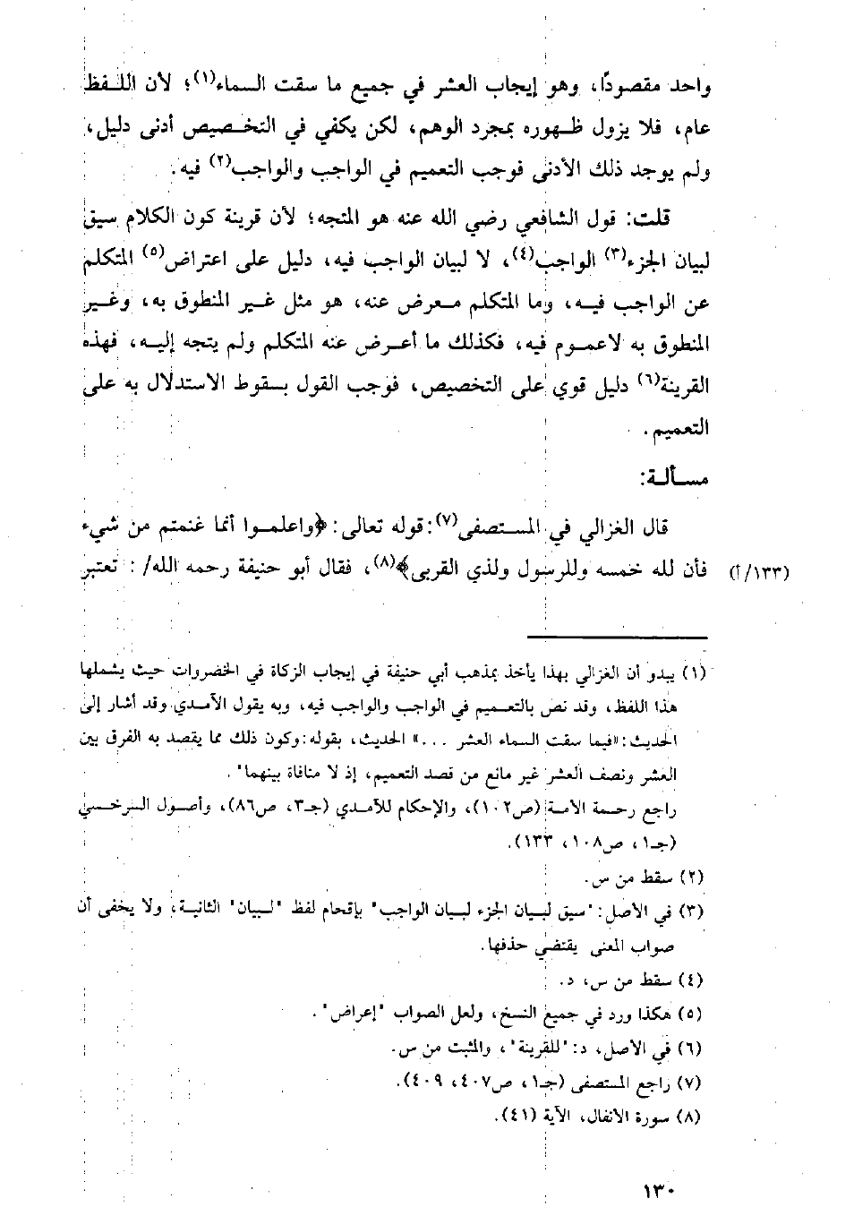قال الغزالي في المستصفى: قوله تعالى: {واعلموا أنما غنمتم من شيء فأن لله خمسه وللرسول ولذي القربي}، فقال أبو حنيفة رحمة الله/: تعتبر