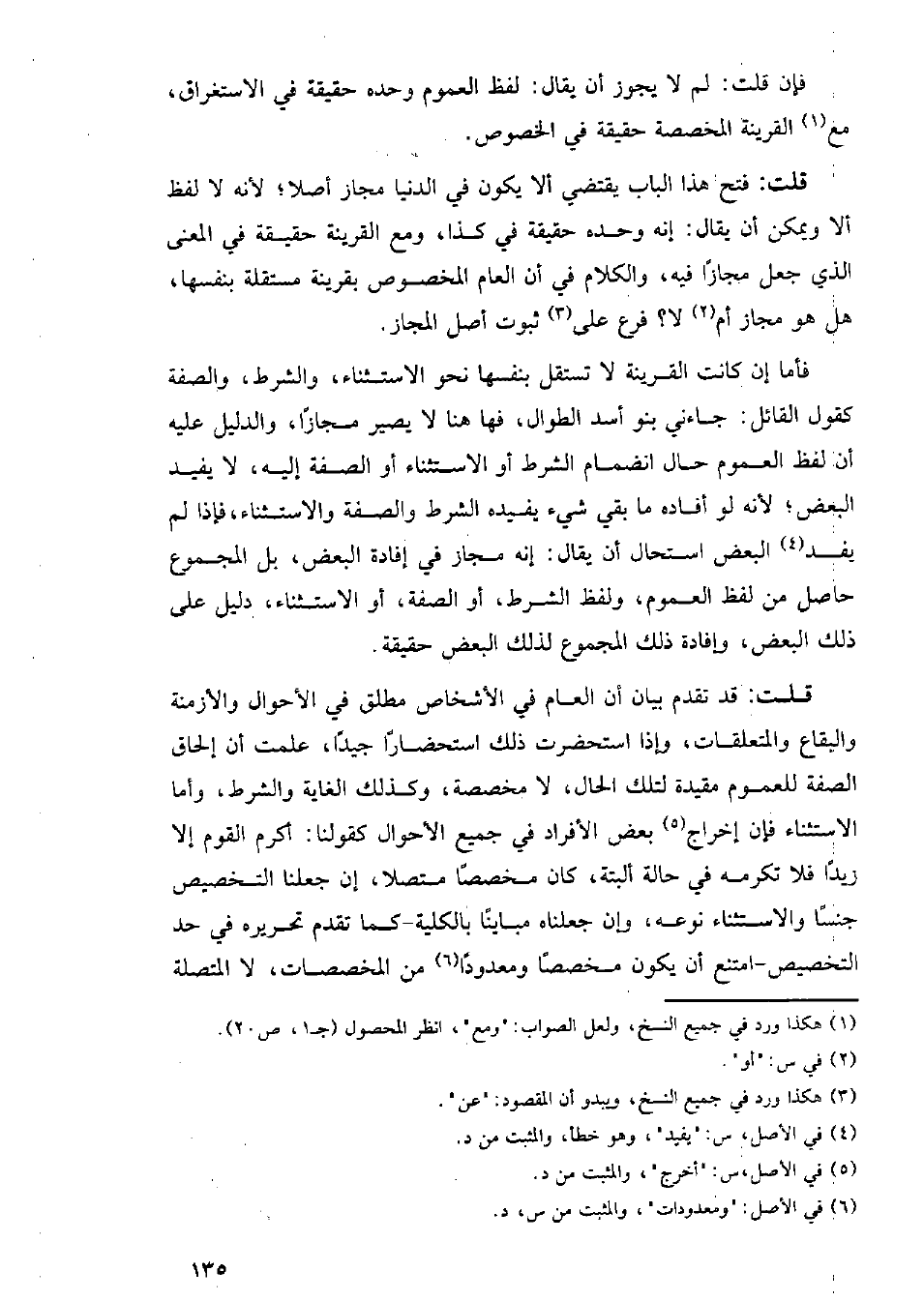 فأما إن كانت القرينة لا تستقل بنفسها نحو الاستثناء، والشرط، والصفة كقول القائل: جاءني بنو أسد الطوال، فها هنا لا يصير مجازًا، والدليل عليه أن لفظ العموم حال انضمام الشرط أو الاستثناء أو الصفة إليه، لا يفيد البعض؛ لأنه لو أفاده ما بقي شيء يفيده الشرط والصفة والاستثناء، فإذا لم يفد البعض استحال أن يقال: إنه مجاز في إفادة البعض، بل المجموع حاصل من لفظ العموم، ولفظ الشرط، أو الصفة، أو الاستثناء، دليل على ذلك البعض، وإفادة ذلك المجموع لذلك البعض حقيقة.