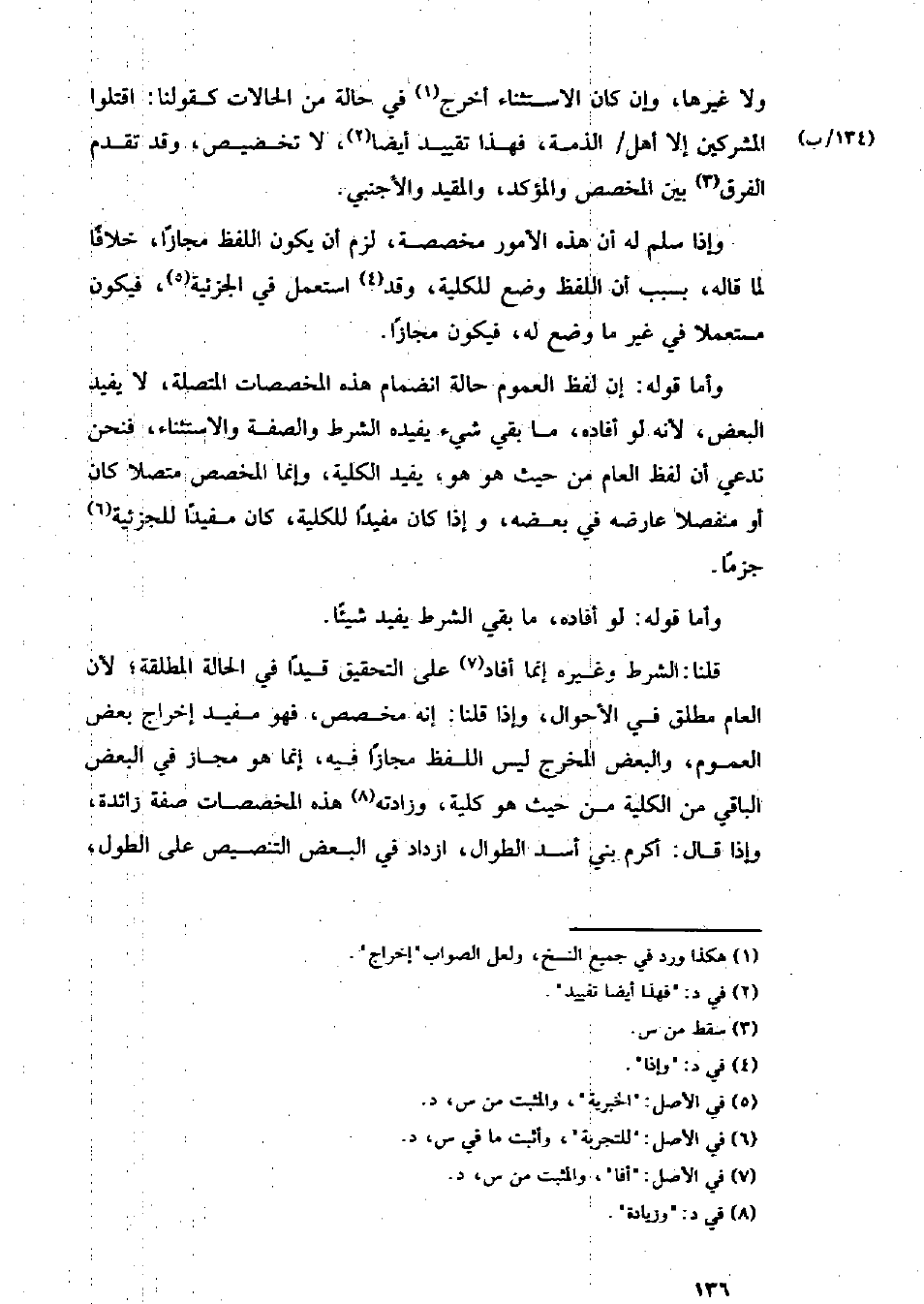 قلنا: الشرط وغيره إنما أفاد على التحقيق قيدًا في الحالة المطلقة؛ لأن العام مطلق في الأحوال، وإذا قلنا: إنه مخصص، فهو مفيد إخراج بعض العموم، والبعض المخرج ليس اللفظ مجازًا فيه، إنما هو مجاز في البعض الباقي من الكلية من حيث هو كلية، وزادته هذه المخصصات صفة زائدة، وإذا قال: أكرم بني أسد الطوال، ازداد في البعض التنصيص على الطول،