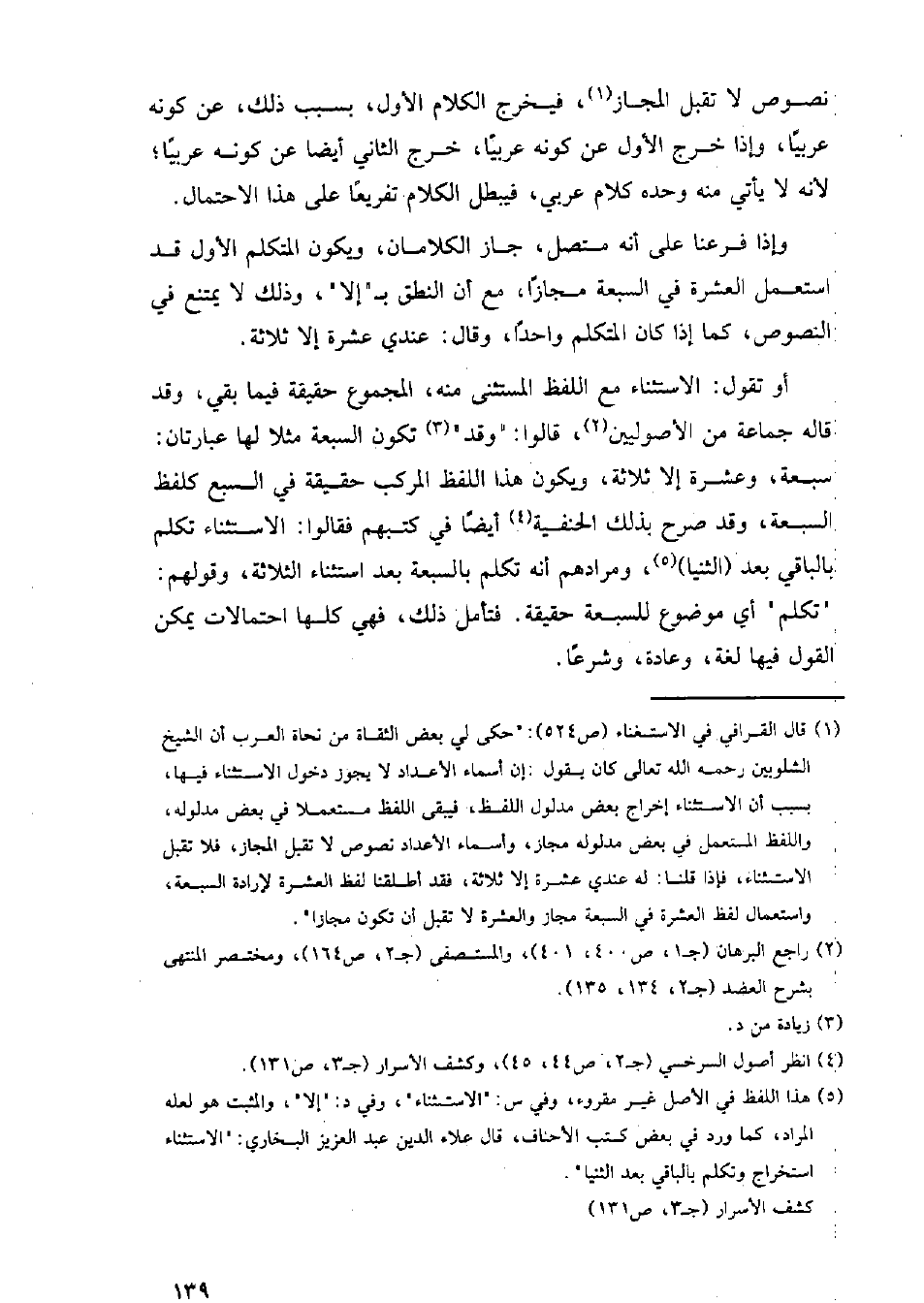 أو تقول: الاستثناء مع اللفظ المستثنى منه، المجموع حقيقة فيما بقى، وقد قاله جماعة من الأصوليين، قالوا: "وقد" تكون السبعة مثلًا لها عبارتان: سبعة، وعشرة إلا ثلاثة، ويكون هذا اللفظ المركب حقيقة في السبع كلفظ السبعة، وقد صرح بذلك الحنفية أيضًا في كتبهم فقالوا: الاستثناء تكلم بالباقي بعد (الثنيا)، ومرادهم أنه تكلم بالسبعة بعد استثناء الثلاثة، وقولهم: "تكلم" أي موضوع للسبعة حقيقة. فتأمل ذلك، فهي كلها احتمالات يمكن القول فيها لغة، وعادة، وشرعًا.