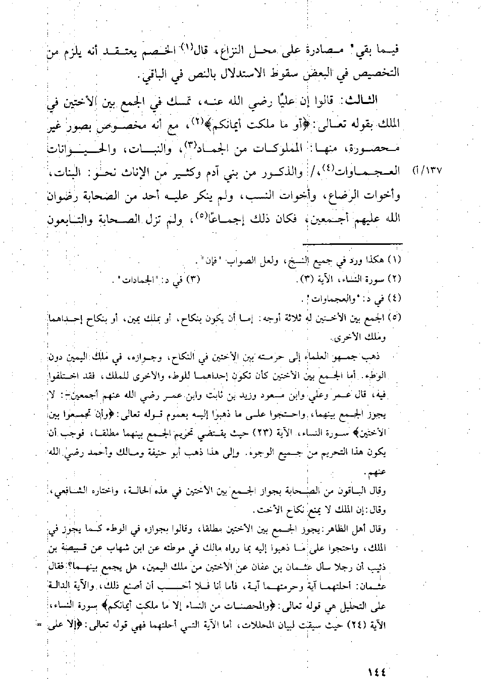 الثالث: قالوا إن عليًا رضي الله عنه، تمسك في الجمع بين الأختين في الملك بقوله تعالى: {أو ما ملكت أمانكم}، مع أنه مخصوص بصور غير محصورة، منها: المملوكات من الجماد، والنبات، والحيوانات العجماوات، / والذكور من بن آدم وكثر من الإناث نحو: البنات، وأخوات الرضاع، وأخوات النسب، ولم ينكر عله أحد من الصحابة رضوان الله عليهم أجمعين، فكان ذلك إجماعًا، ولم تزل الصحابة والتابعون