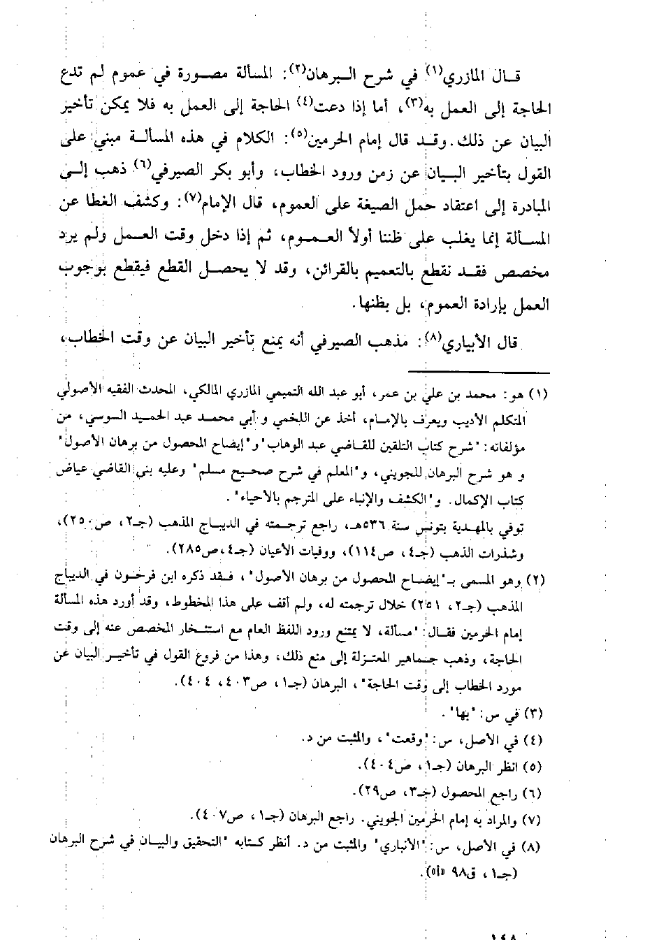 قال المازري ف شرح البرهان: المسألة مصورة في عموم لم تدع الحاجة إلى العمل به، أما إذا دعت الحاجة إلى العمل به فلا يمكن تأخير البيان عن ذلك. وقد قال إمام الحرمين: الكلام في هذه المسألة مبني على القول بتأخير البيان عن زمن ورود الخطاب، وأبو بكر الصيرفي ذهب إلى المبادرة إلى اعتقاد حمل الصيغة على العموم، قال الإمام: وكشف الغطا عن المسألة إنما غلب على ظننا أولًا بالعموم، ثم إذا دخل وقت العمل ولم يرد مخصص فقد نقطع بالتعميم بالقرائن، وقد لا يحصل القطع فيقطع بوجوب العمل بإرادة العموم، بل بظنها.