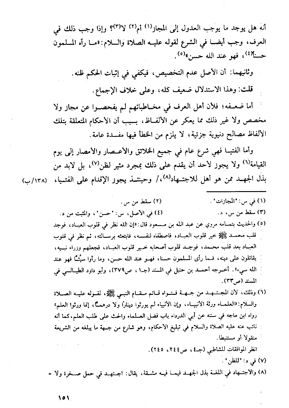 وأما الفتيا فهي شرع عام في جميع الخلائق والأعصار والأمصار إلى يوم القيامة ولا يجوز لأحد أن يقدم على ذلك بمجرد مثير لظن، بل لا بد من بذل الجهد ممن هو أهل للاجتهاد، وحينئذ يجوز الإقدام على الفتيا، (١٣٨/ ب)