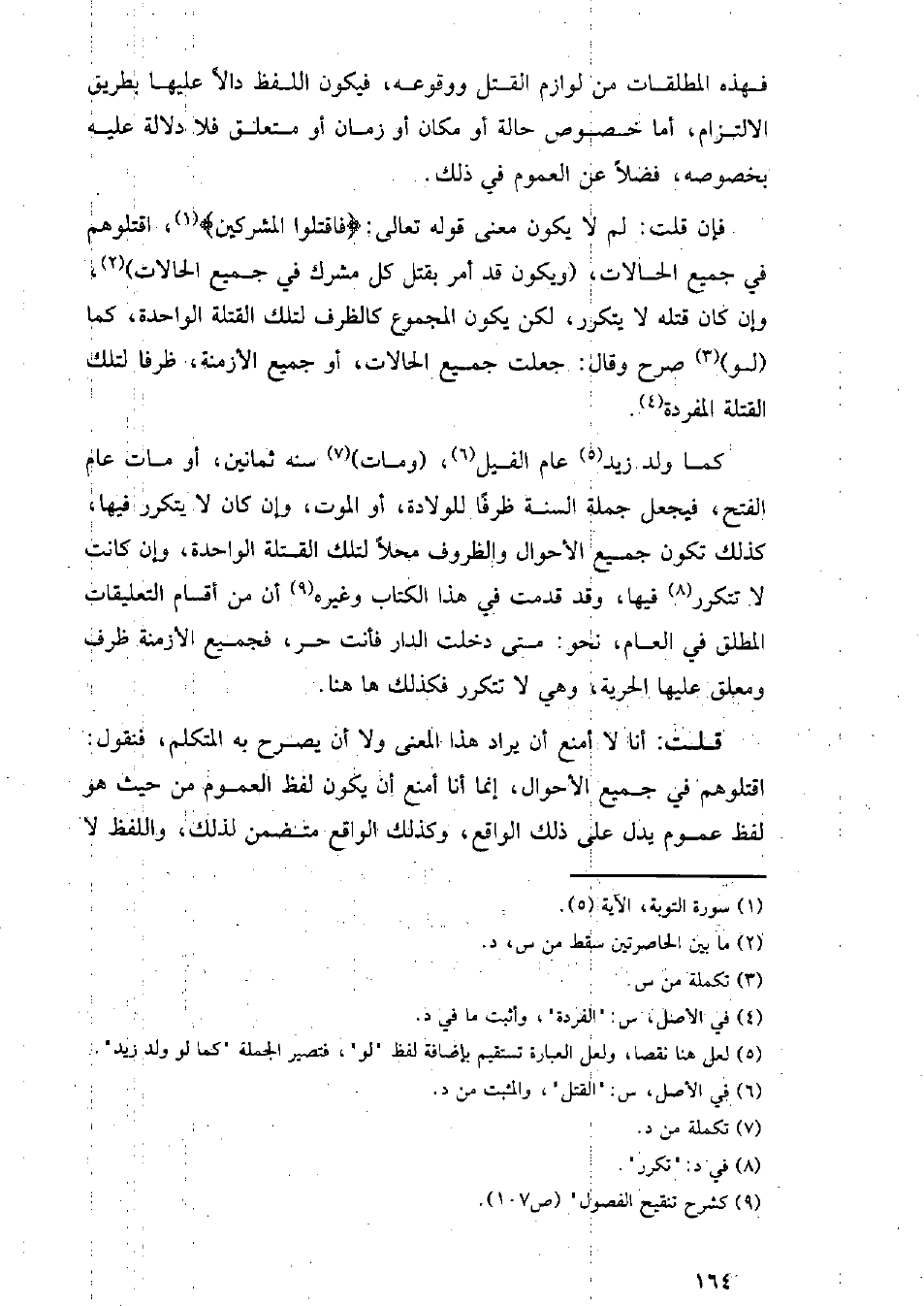 فإن قلت: لم لا يكون معنى قوله تعالى: {فاقتلوا المشركين}، اقتلوهم في جميع الحالات، (ويكون قد أمر بقتل كل مشرك في جميع الحالات)، وإن كان قتله لا يتكرر، لكن يكون المجموع كالظرف لتلك القتلة الواحدة، كما (لو) صرح وقال: جعلت جميع الحالات، أو جميع الأزمنة، ظرفا لتلك القتلة المفردة.