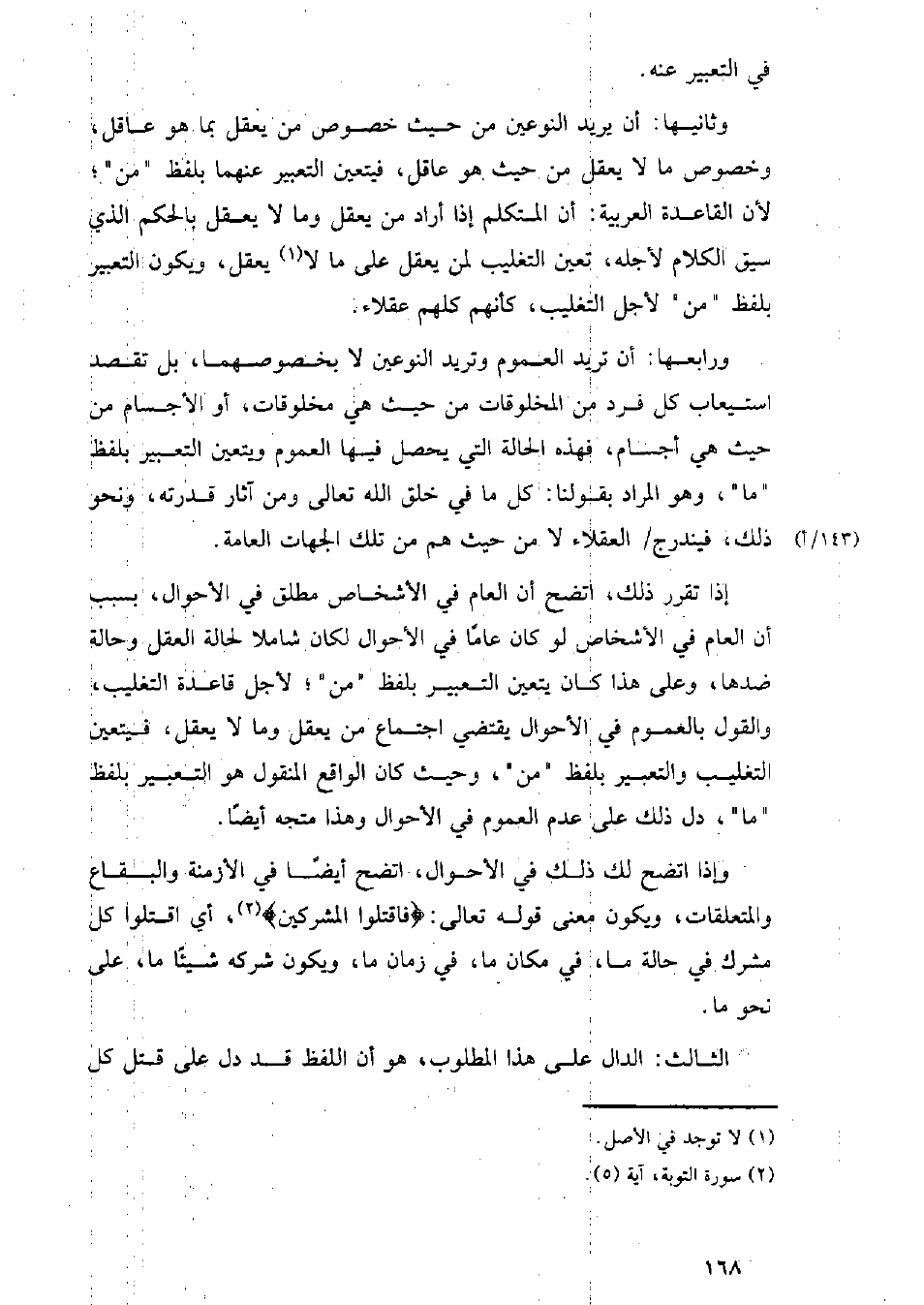 وثانيهما: أن يريد النوعين من حيث خصوص من يعقل بما هو عاقل، وخصوص ما لا يعقل من حيث هو عاقل، فيتعين التعبير عنهما بلفظ "من"؛ لأن القاعدة العربية: أن المتكلم إذا أراد من يعقل وما لا يعقل بالحكم الذي سيق الكلام لأجله، تعين التغليب لمن يعقل على ما لا يعقل، ويكون التعبير بلفظ "من" لأجل التغليب، كأنهم كلهم عقلاء.