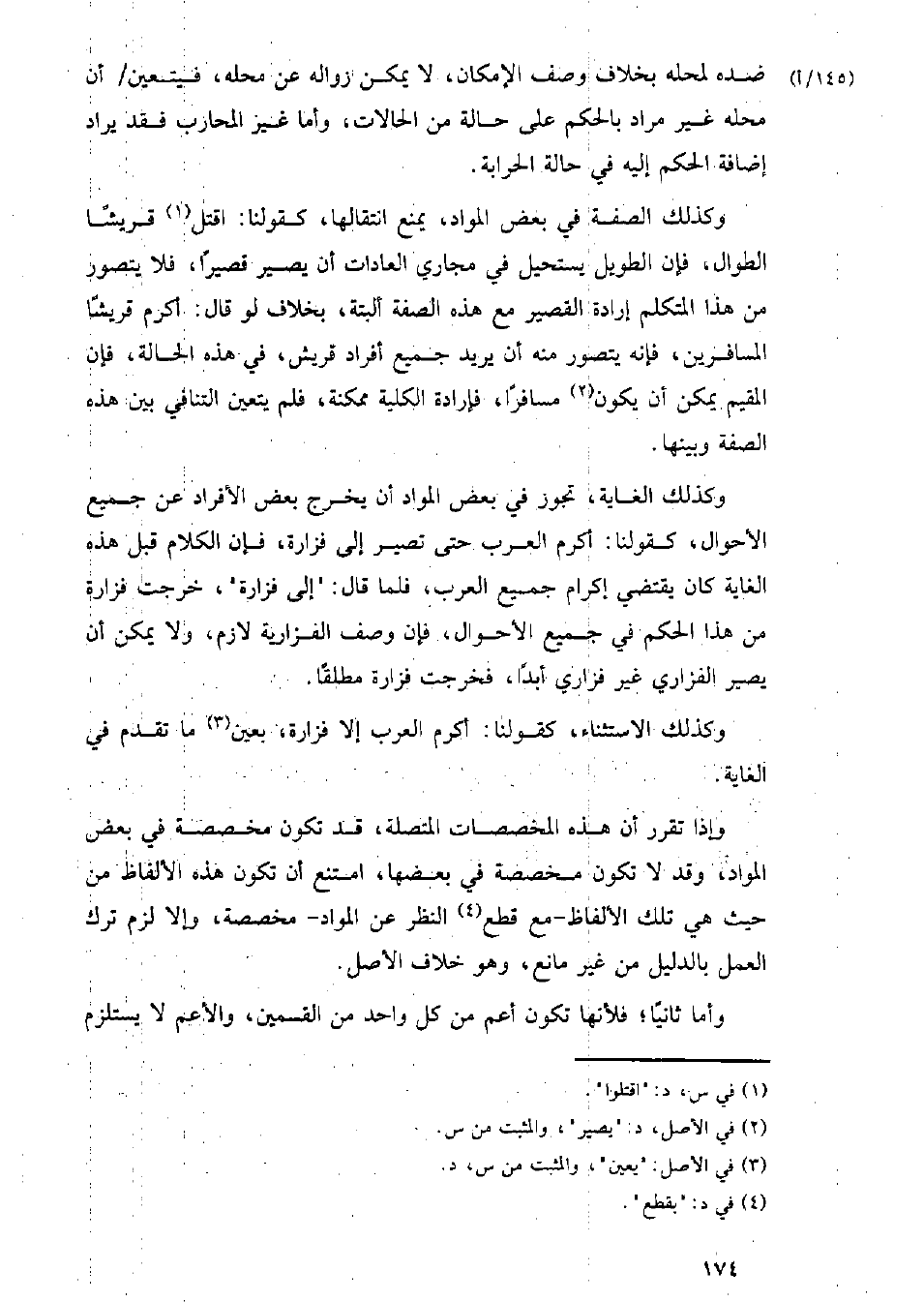 وكذلك الصفة في بعض المواد، يمنع انتقالها، كقولنا: اقتل قريشا الطوال، فإن الطويل يستحيل في مجاري العادات أن يصير قصيرا، فلا يتصور من هذا المتكلم إرادة القصير مع هذه الصفة ألبتة، بخلاف لو قال: أكرم قريشا المسافرين، فإنه يتصور منه أن يريد جميع أفراد قريش، في هذه الحالة، فإن المقيم يمكن أن يكون مسافرا، فإرادة الكلية ممكنة، فلم يتعين التنافي بين هذه الصفة وبينها.