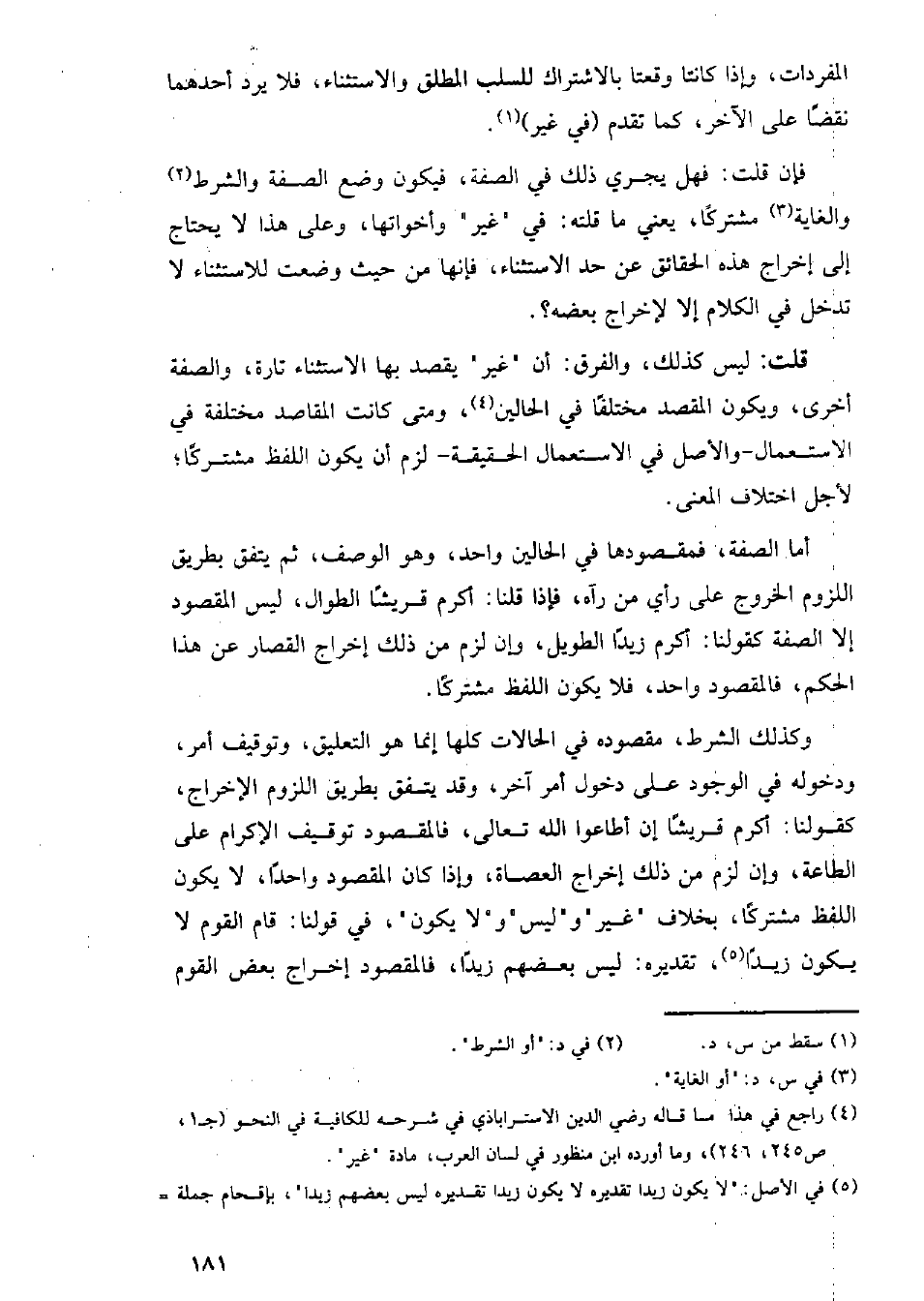 فإن قلت: فهل يجري ذلك في الصفة، فيكون وضع الصفة والشرط والغاية مشتركا، يعني ما قلته: في (غير) وأخواتها، وعلى هذا لا يحتاج إلى إخراج هذه الحقائق عن حد الاستثناء، فإنها من حيث وضعت للاستثناء لا تدخل في الكلام إلا لإخراج بعضه؟ .