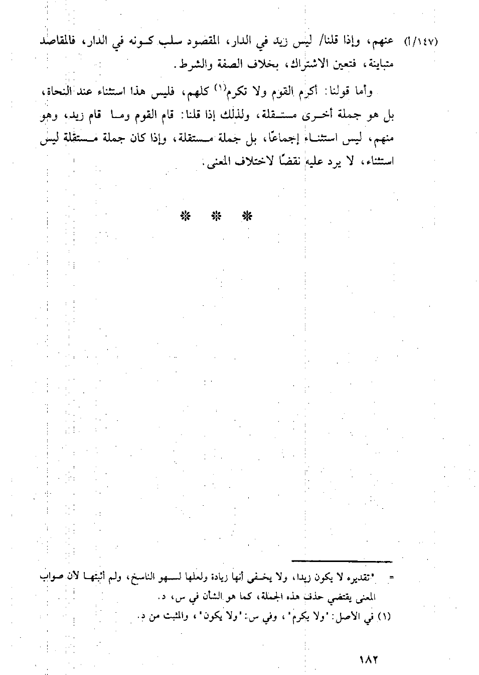 (١٤٧/ أ) عنهم وإذا قلنا/ليس زيد في الدار، المقصود سلب كونه في الدار، فالمقاصد متباينة، فتعين الاشتراك، بخلاف الصفة والشرط.