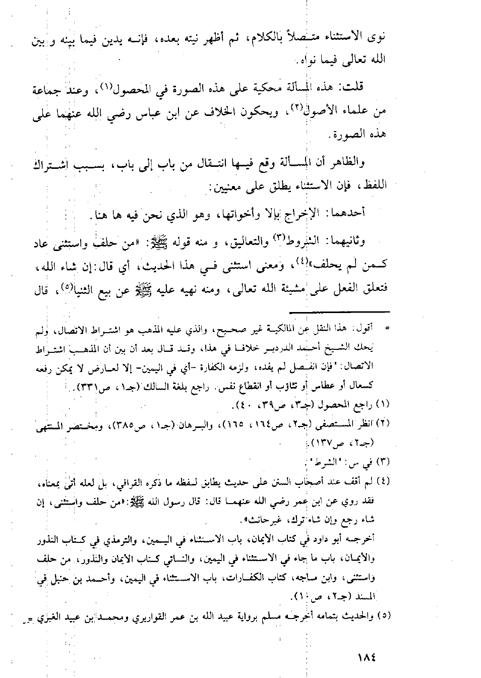 وثانيهما: الشروط والتعاليق، ومنه قوله - صلى الله عليه وسلم -: (من حلف واستثنى عاد كمن لم يحلف)، ومعنى استثنى في هذا الحديث، أي قال: إن شاء الله، فتعلق الفعل على مشيئة الله تعالى، ومنه نهيه عليه - صلى الله عليه وسلم - عن بيع الثنيا، قال