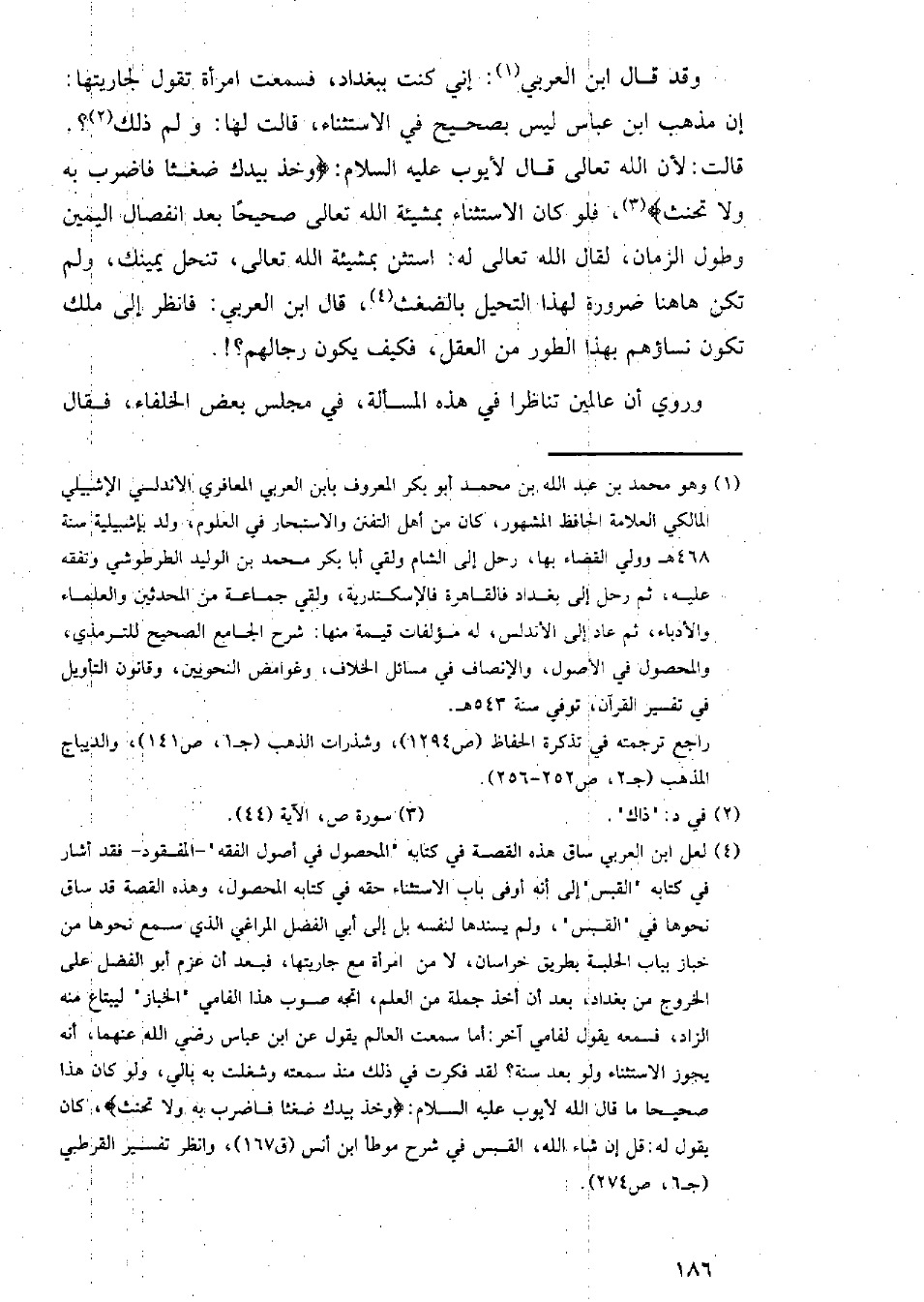 وقد قال ابن العربي: إني كنت ببغداد، فسمعت امرأة تقول لجاريتها: إن مذهب ابن عباس ليس بصحيح في الاستثناء، قالت لها: ولم ذلك؟ قالت: لأن الله تعالى قال لأيوب عليه السلام: {وخذ بيدك ضغثا فاضرب به ولا تحنث}، فلو كان الاستثناء بمشيئة الله تعالى صحيحا بعد انفصال اليمين وطول الزمان، لقال الله تعالى له: استثن بمشيئة الله تعالى، تنحل يمينك، ولم تكن ها هنا ضرورة لهذا التحليل بالضغث، قال ابن العربي: فانظر إلى ملك تكون نساؤهم بهذا الطور من العقل، فكيف يكون رجالهم؟ !