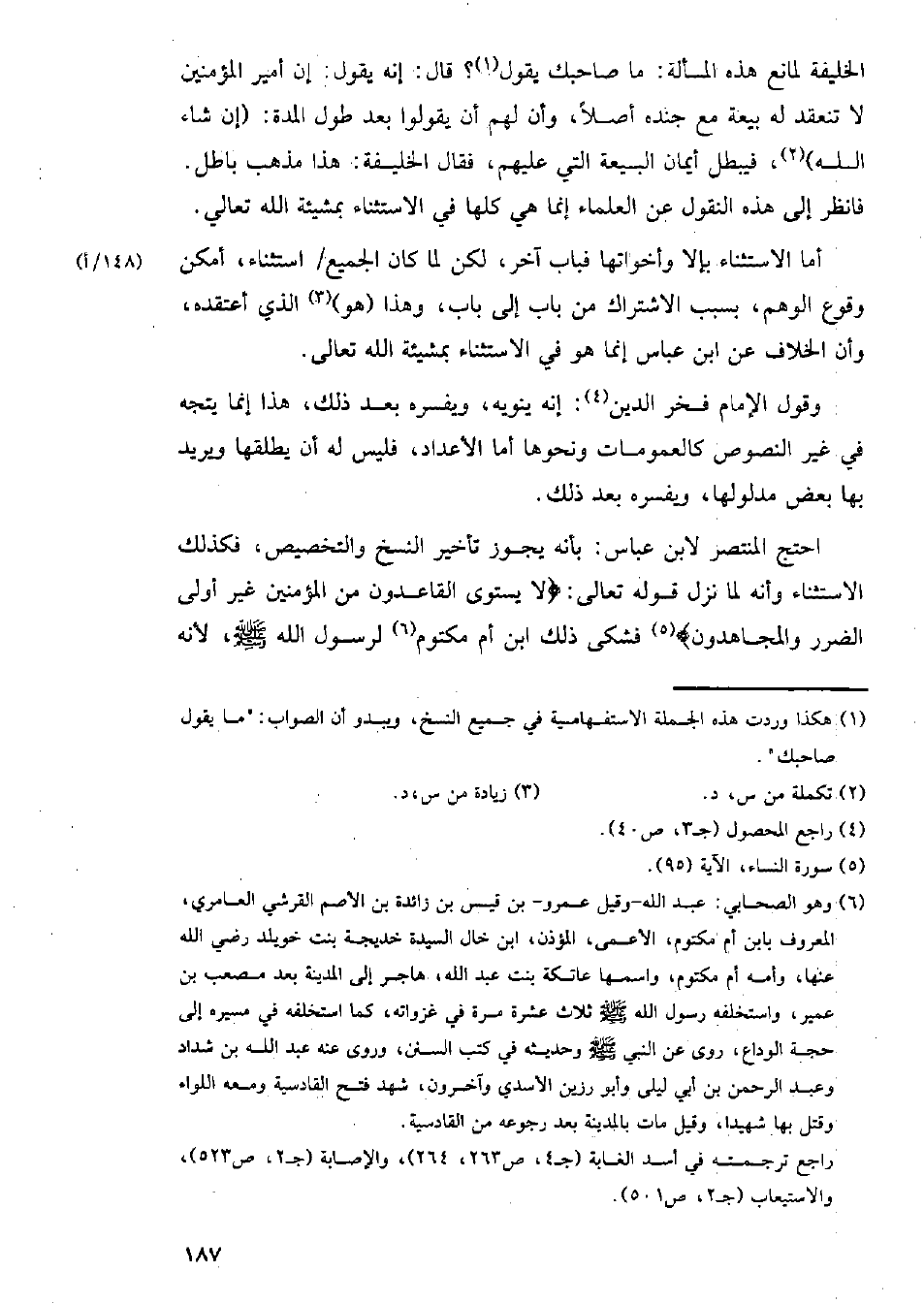احتج المنتصر لابن عباس: بأنه يجوز تأخير النسخ والتخصيص، فكذلك الاستثناء وأنه لما نزل قوله تعالى: {لا يستوي القاعدون من المؤمنين غير أولي الضرر والمجاهدون} فشكى ذلك ابن أم مكتوم لرسول الله - صلى الله عليه وسلم -، لأنه