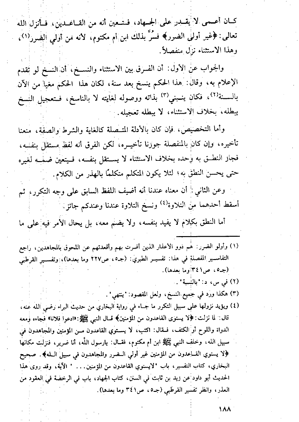 كان أعمى لا يقدر على الجهاد، فتعين أنه من القاعدين، فأنزل الله تعالى: {غير أولي الضرر} فسر بذلك ابن أم مكتوم، لأنه من أولي الضرر، وهذا الاستثناء نزل منفصلا.
