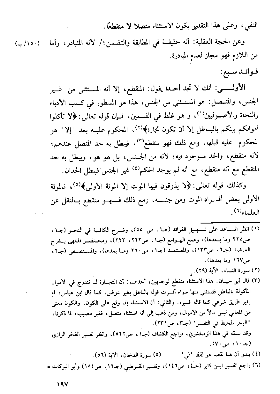الأولى: أنك لا تجد أحدا يقول: المنقطع، إلا أنه المستثنى من غير الجنس، والمتصل: هو المستثنى من الجنس، هذا هو المسطور في كتب الأدباء والنحاة والأصوليين، وهو غلط في القسمين، فإن قوله تعالى: {لا تأكلوا أموالكم بينكم بالباطل إلا أن تكون تجارة}، المحكوم عليه بعد "إلا" هو المحكوم عليه قبلها، ومع ذلك فهو منقطع، فيبطل به حد المتصل عندهم؛ لأنه منقطع، والحد موجود فيه؛ لأنه من الجنس، بل هو هو، ويبطل به حد المنقطع مع أنه منقطع، مع أنه لم يوجد الحكم غير الجنس فيبطل الحدان.