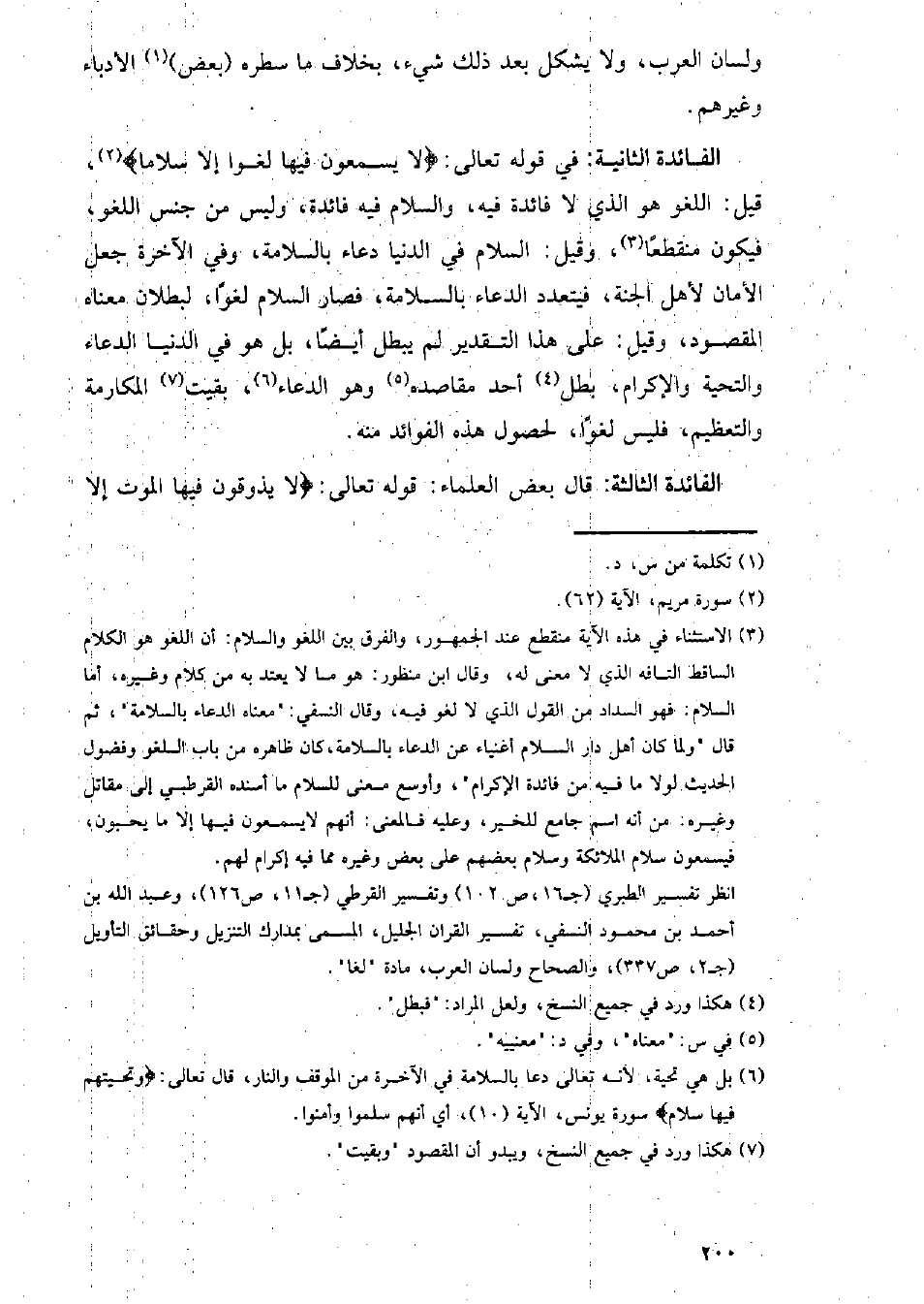 الفائدة الثانية: في قوله تعالى: {لا يسمعون فيها لغوا إلا سلاما}، قيل: اللغو هو الذي لا فائدة فيه، والسلام فيه فائدة، وليس من جنس اللغو، فيكون منقطعا، وقيل: السلام في الدنيا دعاء بالسلامة، وفي الآخرة جعل الأمان لأهل الجنة، فيتعدد الدعاء بالسلامة، فصار السلام لغوا، لبطلان معناه المقصود، وقيل: على هذا التقدير لم يبطل أيضا، بل هو في الدنيا الدعاء والتحية والإكرام، بطل أحد مقاصده وهو الدعاء، بقيت المكارمة والتعظيم، فليس لغوا، لحصول هذه الفوائد منه.