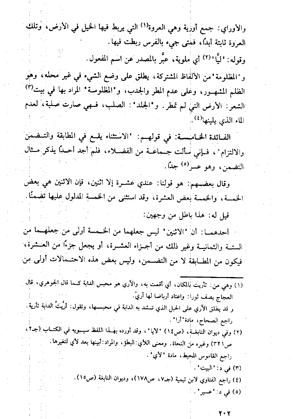 الفائدة الخامسة: في قولهم: (الاستثناء يقع في المطابقة والتضمن والالتزام)، فإني سألت جماعة من الفضلاء، فلم أجد أحدا يذكر مثال التضمن، وهو عسر جدا.