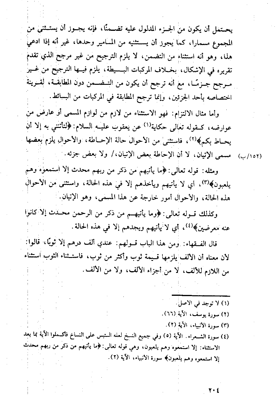 وأما مثال الالتزام: فهو الاستثناء من لازم من لوازم المسمى أو عارض من عوارضه، كقوله تعالى حكاية عن يعقوب عليه السلام: {لتأتنني به إلا أن يحاط بكم}، فاستثنى من الأحوال حالة الإحاطة، والأحوال يلزم بعضها مسمى الإتيان، / ولا بعض جزئه. (١٥٢/ ب)
