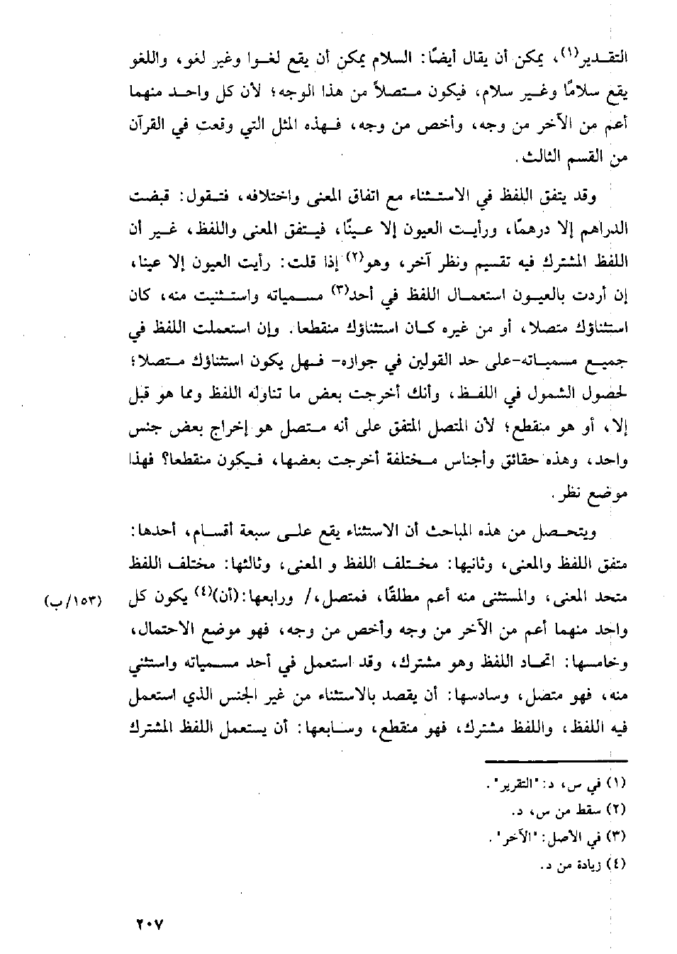 وقد يتفق اللفظ في الاستثناء مع اتفاق المعنى واختلافه، فتقول: قبضت الدراهم إلا درهما، ورأيت العيون إلا عينا، فيتفق المعنى واللفظ، غير أن اللفظ المشترك فيه تقسيم ونظر آخر، وهو إذا قلت: رأيت العيون إلا عينا، إذا أردت بالعيون استعمال اللفظ في أحد مسمياته واستثنيت منه، كان استثناؤك متصلا، أو من غيره كان استثناؤك منقطعا، وإن استعملت اللفظ في جميع مسمياته -على حد القولين في جوازه- فهل يكون استثناؤك متصلا؛ لحصول الشمول في اللفظ، وأنك أخرجت بعض ما تناوله اللفظ ومما هو قبل إلا، أو هو منقطع؛ لأن المتصل المتفق على أنه متصل هو إخراج بعض جنس واحد، وهذه حقائق وأجناس مختلفة أخرجت بعضها، فيكون منقطعا؟ فهذا موضع نظر.