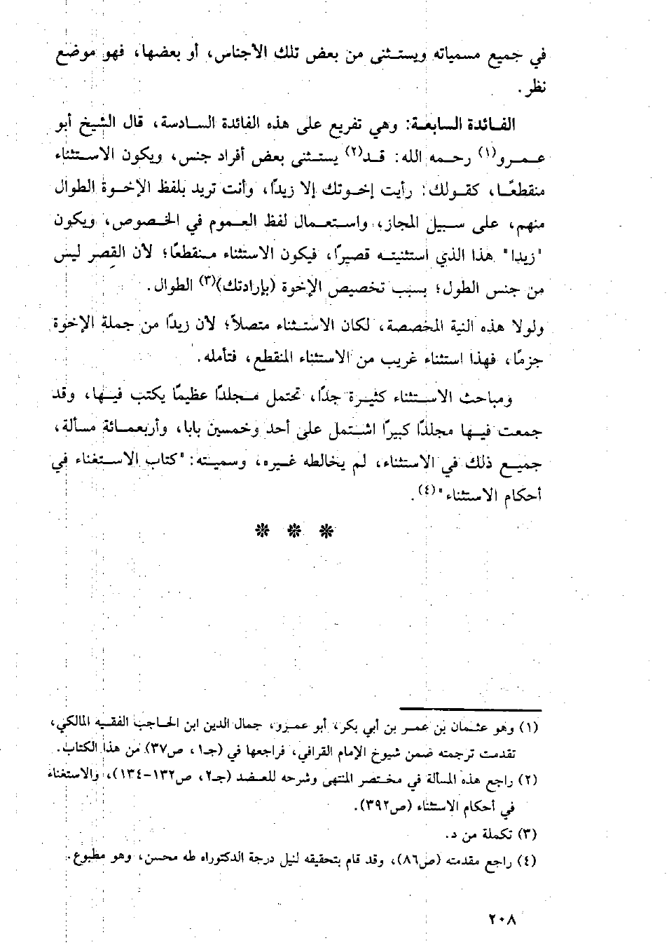 ومباحث الاستثناء كثيرة جدا، تحتمل مجلدا عظيما يكتب فيها، وقد جمعت فيها مجلدا كبيرا اشتمل على أحد وخمسين بابا، وأربعمائة مسألة، جميع ذلك في الاستثناء، لم يخالطه غيره، وسميته: "كتاب الاستغناء في أحكام الاستثناء".