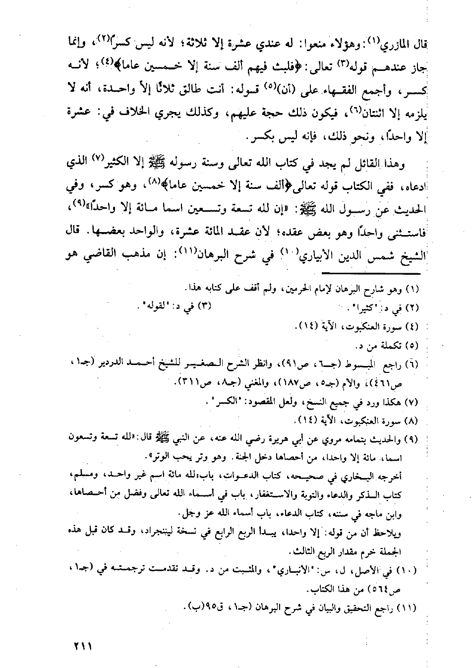 وهذا القائل لم يجد في كتاب الله تعالى وسنة رسوله - صلى الله عليه وسلم - إلا الكثير الذي ادعاه، وفي الحديث عن رسول الله - صلى الله عليه وسلم -: (إن لله تسعة وتسعين اسما مائة إلا واحدا)، فاستثنى واحدا وهو بعض عقدة؛ لأن عقد المائة عشرة، والواحد بعضه. قال الشيخ شمس الدين الأبياري في شرح البرهان: إن مذهب القاضي هو