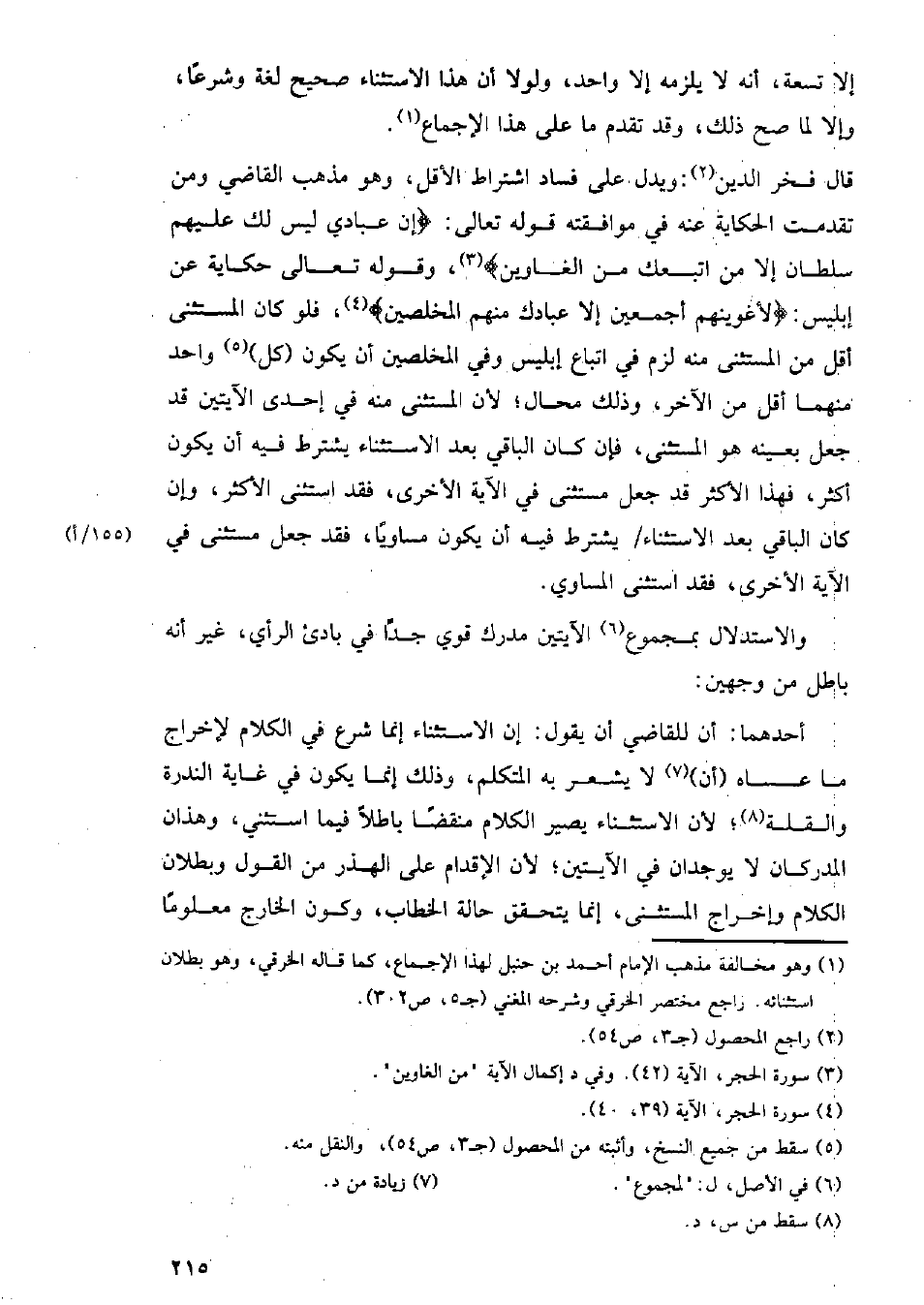 قال فخر الدين: ويدل على فساد اشتراط الأقل، وهو مذهب القاضي ومن تقدمت الحكاية عنه في موافقته قوله تعالى: {إن عبادي ليس لك عليهم سلطان إلا من اتبعك من الغاوين}، وقوله تعالى حكاية عن إبليس: {لأغوينهم أجمعين إلا عبادك منهم المخلصين}، فلو كان المستثنى أقل من المستثنى منه لزم في اتباع إبليس وفي المخلصين أن يكون (كل) واحد منهما أقل من الآخر، وذلك محال؛ لأن المستثنى منه في إحدى الآيتين قد جعل بعينه هو المستثنى، فإن كان الباقي بعد الاستثناء يشترط فيه أن يكون أكثر، فهذا الأكثر قد جعل مستثنى في الآية الأخرى، فقد استثنى الأكثر، وإن كان الباقي بعد الاستثناء/ يشترط فيه أن يكون مساويا، فقد جعل مستثنى في الآية الأخرى، فقد استثنى المساوي. (١٥٥/ أ)