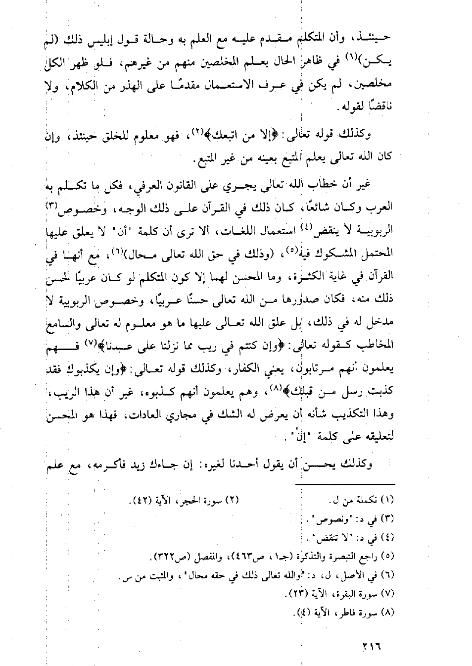 غير أن خطاب الله تعالى يجري على القانون العرفي، فكل ما تكلم به العرب وكان شائعا، كان ذلك في القرآن على ذلك الوجه، وخصوص الربوبية لا ينقض استعمال اللغات، ألا ترى أن كلمة (أن) لا يعلق عليها المحتمل المشكوك فيه، (وذلك في حق الله تعالى محال)، مع أنها في القرآن في غاية الكثرة، وما المحسن لهما إلا قول المتكلم لو كان عربيا لحسن ذلك منه، فكان صدورها من الله تعالى عليها ما هو معلوم له تعالى والسامع المخاطب كقوله تعالى: {وإن كنتم في ريب مما نزلنا على عبدنا} فهم يعلمون أنهم مرتابون، يعني الكفار، وكذلك قوله تعالى: {وإن كذبوك فقد كذب رسل من قبلك}، وهم يعلمون أنهم كذبوه، غير أن هذا الريب، وهذا التكذيب شأنه أن يعرض له الشك في مجاري العادات، فهذا هو المحسن لتعليقه على كلمة (إن).