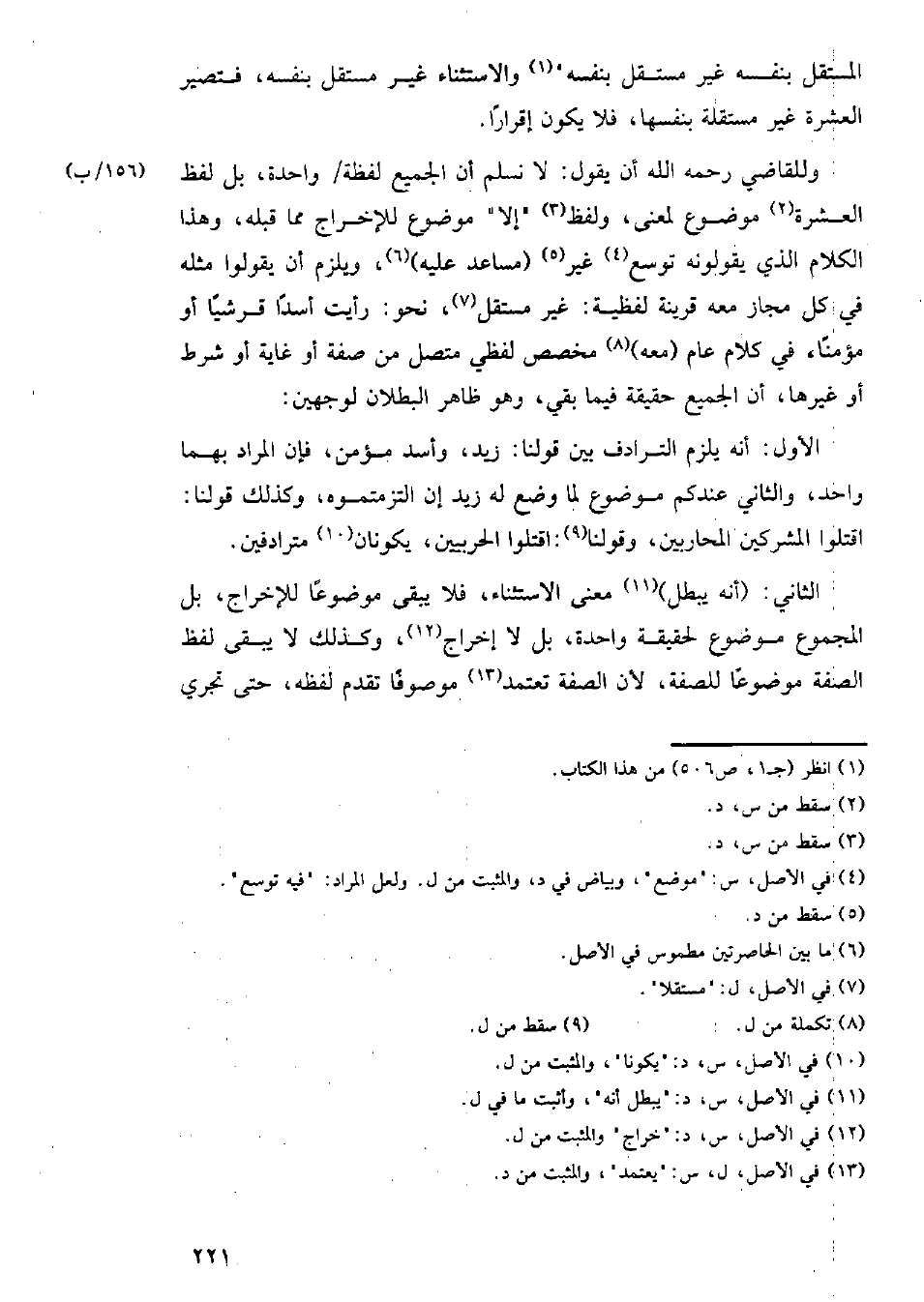 وللقاضي رحمه الله أن يقول: لا نسلم أن الجميع لفظة/ (١٥٦/ ب) واحدة، بل لفظ العشرة موضوع لمعنى، ولفظ "إلا" موضوع للإخراج مما قبله، وهذا الكلام الذي يقولونه توسع غير (مساعد عليه)، ويلزم أن يقولوا مثله في كل مجاز معه قرينة لفظية: غير مستقل، نحو: رأيت أسدًا قرشيًا أو مؤمنًا، في كلام عام (معه) مخصص لفظي متصل من صفة أو غاية أو شرط أو غيرها، أن الجميع حقيقة فيما بقي، وهو ظاهر البطلان لوجهين: