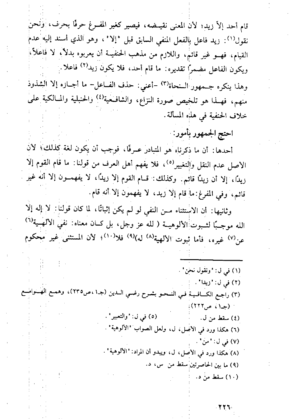 قام أحد إلا زيد؛ لأن المعنى نقيضه، فيصير كغير المفرغ حرفًا بحرف، ونحن نقول: زيد فاعل بالفعل المنفي السابق قبل "إلا"، وهو الذي أسند إليه عدم القيام، فهو غير قائم، واللازم من مذهب الحنفية أن يعربوه بدلًا، لا فاعلًا، ويكون الفاعل مضمرًا تقديره: ما قام أحد، فلا يكون زيد فاعلًا.