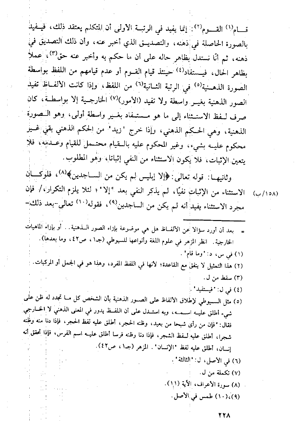 قام القوم: إنما يفيد في الرتبة الأولى أن المتكلم يعتقد ذلك، فيفيد بالصورة الحاصلة في ذهنه، والتصديق الذي أخبر عنه، وأن ذلك التصديق في ذهنه، ثم أنا نستدل بظاهر حاله على أن ما حكم به وأخبر عنه حق، عملًا بظاهر الحال، فيستفاد حينئذ قيام القوم أو عدم قيامهم من اللفظ بواسطة الصورة الذهنية بغير واسطة ولا تفيد (الأمور) الخارجية إلا بواسطة، كان صرف لفظ الاستثناء إلى ما هو مستفاد بغير واسطة أولى، وهو الصورة الذهنية، وهي الحكم الذهني، وإذا خرج "زيد" من الحكم الذهني بقي غير محكوم عليه بشيء، وغير المحكوم عليه بالقيام محتمل للقيام وعدمه، فلا يتعين الإثبات، فلا يكون الاستثناء من النفي إثباتًا، وهو المطلوب.