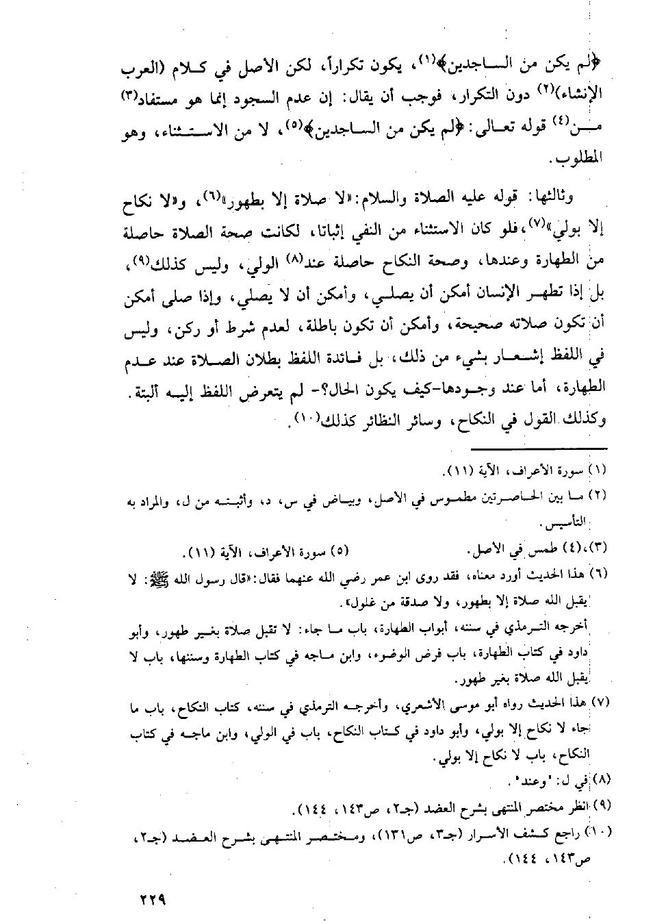 وثالثها: قوله عليه الصلاة والسلام: "لا صلاة إلا بطهور"، و"لا نكاح إلا بولي"، فلو كان الاستثناء من النفي إثباتًا، لكانت صحة الصلاة حاصلة من الطهارة وعندها، وصحة النكاح حاصلة عند الولي، وليس كذلك، بل إن تطهر الإنسان أمكن أن يصلي، وأمكن أن لا يصلي، وإذا صلى أمكن أن تكون صلاته صحيحة، وأمكن أن تكون باطلة، لعدم شرط أو ركن، وليس في اللفظ إشعار بشيء من ذلك، بل فائدة اللفظ بطلان الصلاة عند عدم الطهارة، أما عند وجودها _كيف يكون الحال؟ _ لم يتعرض اللفظ إليه ألبتة. وكذلك القول في النكاح، وسائر النظائر كذلك.
