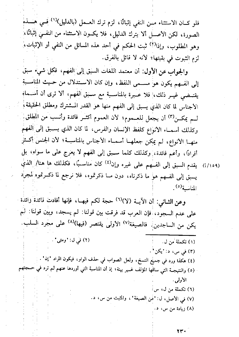 فلو كان الاستثناء من النفي إثباتًا، لزم ترك العمل (بالدليل) في هذه الصورة، لكن الأصل ألا يترك الدليل، فلا يكون الاستثناء من النفي إثباتًا، وهو المطلوب، وإذا ثبت الحكم في أحد هذه المسائل من النفي أو الإثبات، لزم الثبوت في بقيتها؛ لأنه لا قائل بالفرق.