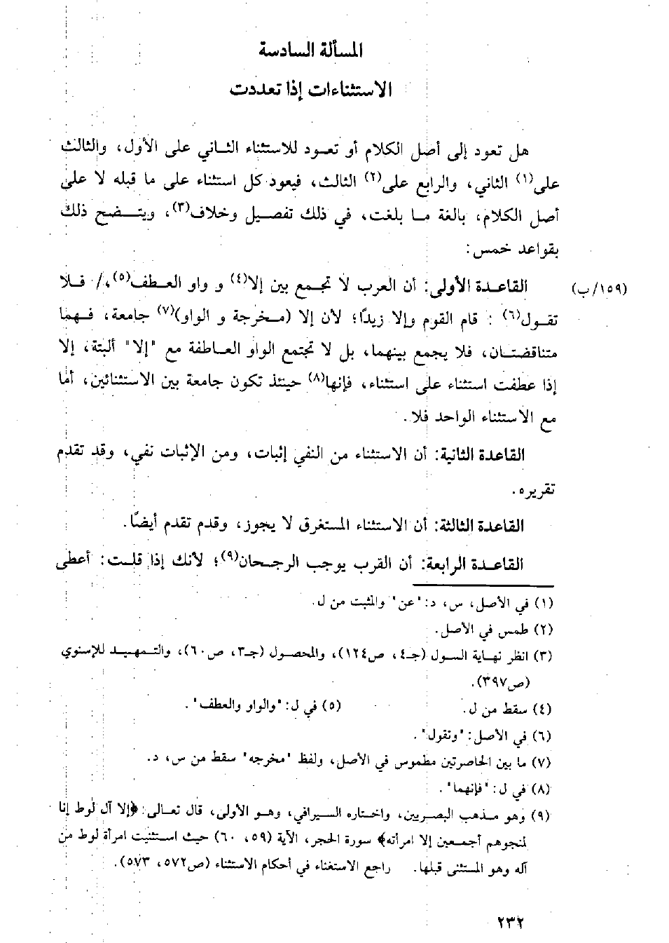 هل تعود إلى أصل الكلام أو تعود للاستثناء الثاني على الأول، والثالث على الثاني، والرابع على الثالث، فيعود كل استثناء على ما قبله لا على أصل الكلام، بالغة ما بلغت، في ذلك تفصيل وخلاف، ويتضح ذلك بقواعد خمس: