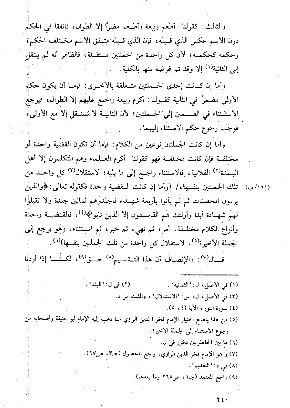 وأما إن كانت الجملتان نوعين من الكلام: فإما أن تكون القضية واحدة أو مختلفة فإن كانت مختلفة فهو كقولنا: أكرم العلماء وهم المتكلمون إلا أهل البلدة الفلانية، فالاستثناء راجع إلى ما يليه؛ لاستقلال كل واحد من تلك الجملتين بنفسها، / (١٦١/ ب) (وأما إن كانت القضية واحدة فكقوله تعالى: {والذين يرمون المحصنات ثم لم يأتوا بأربعة شهداء فاجلدوهم ثمانين جلدة ولا تقبلوا لهم شهادة أبدًا وأولئك هم الفاسقون إلا الذين تابوا}، فالقضية واحدة وأنواع الكلام مختلفة، أمر، ثم نهي، ثم خبر، ثم استثناء، وهو يرجع إلى الجملة الأخيرة، الاستقلال كل واحدة من تلك الجملتين بنفسها).