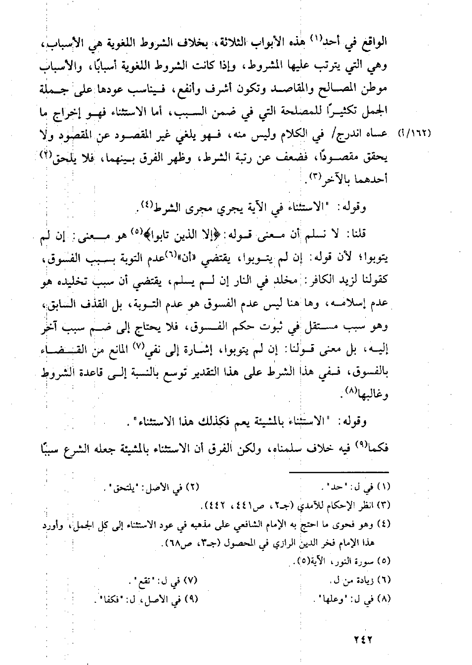 الواقع في أحد هذه الأبواب الثلاثة، بخلاف الشروط اللغوية هي الأسباب، وهي التي يترتب عليها المشروط، وإذا كانت الشروط اللغوية أسبابًا، والأسباب مواطن المصالح والمقاصد وتكون أشرف وأنفع، فيتناسب عودها على جملة الجمل تكثيرًا للمصلحة التي في ضمن السبب، أما الاستثناء فهو إخراج ما عساه اندرج/ (١٦٢/ أ) في الكلام وليس منه، فهو يلغي غير المقصود عن المقصود ولا يحقق مقصودًا، فضعف عن رتبة الشرط، وظهر الفرق بينهما، فلا يلحق أحدهما بالآخر.