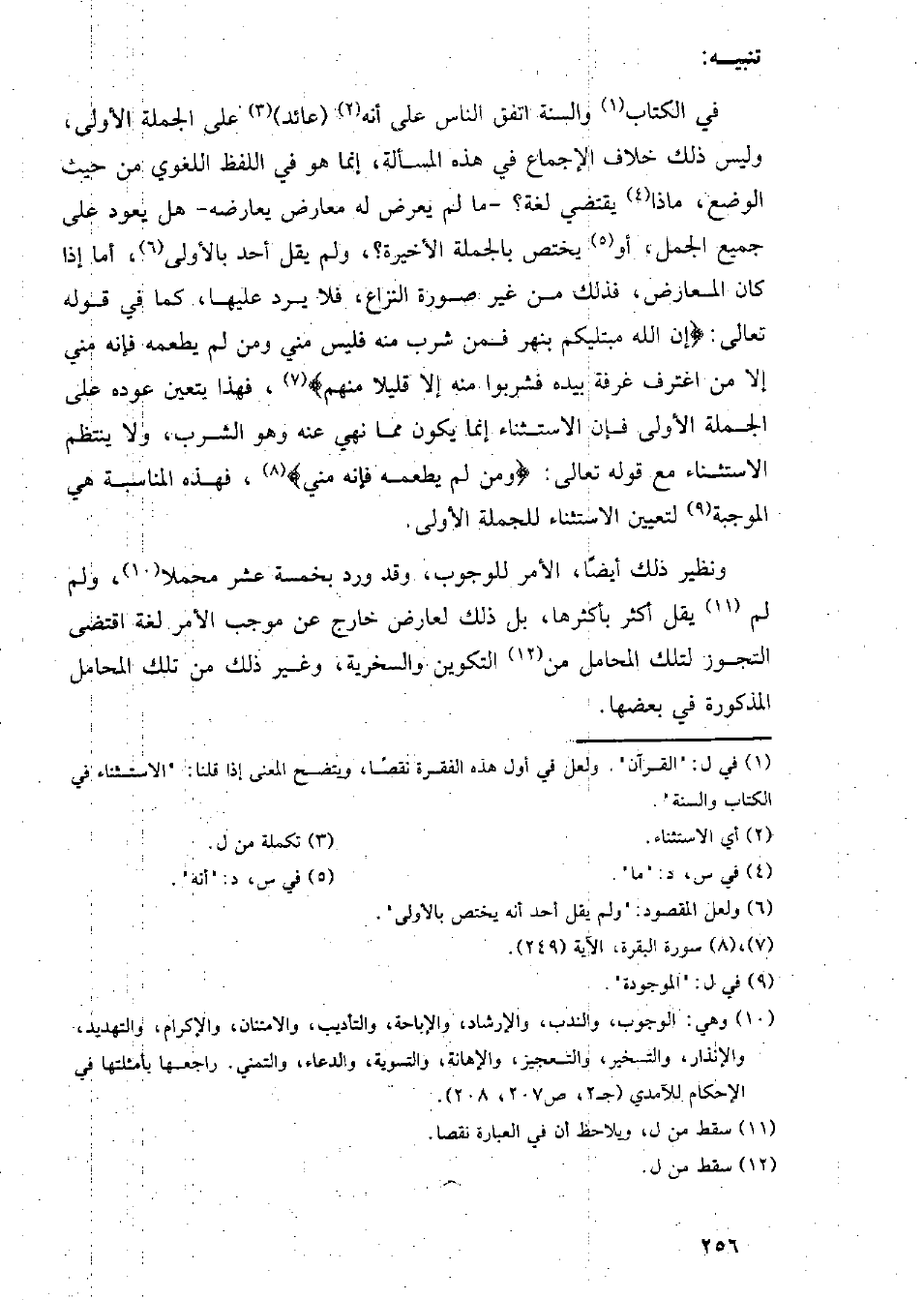 في الكتاب والسنة اتفق الناس على أنه (عائد) على الجملة الأولى, وليس ذلك خلاف الإجماع في هذه المسألة, إنما هو في اللفظ اللغوي من حيث الوضع, ماذا يقتضي لغة؟ - ما لم يعرض له معارض يعارضه- هل يعود على جميع الجمل, أو يختص بالجملة الأخيرة؟ , ولم يقل أحد بالأولى, أما إذا كان المعارض, فذلك من غير صورة النزاع, فلا يرد عليها, كما في قوله تعالى: {إن الله مبتليكم بنهر فمن شرب منه فليس مني ومن لم يطعمه فإنه مني إلا من اغترف غرفة بيده فشربوا منه إلا قليلا منهم} , فهذا يتعين عوده على الجملة الأولى فإن الاستثناء إنما يكون مما نهي عنه وهو الشرب, ولا ينتظم الاستثناء مع قوله تعالى: {ومن لم يطعمه فإنه مني} , فهذه المناسبة هي الموجبة لتعيين الاستثناء للجملة الأولى.