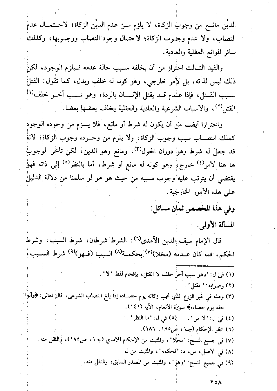 واحترازا أيضا من أن يكون له شرط أو مانع, فلا يلزم من وجوده الوجود كملك النصاب سبب وجوب الزكاة, ولا يلزم من وجوده وجوب الزكاة؛ لأنه قد جعل له شرط وهو دوران الحول, ومانع وهو الدين, لكن تأخر الوجوب ها هنا لأمر خارج, وهو كونه له مانع أو شرط, أما بالنظر إلى ذاته فهو يقتضي أن يترتب عليه وجوب مسببه من حيث هو لو سلمنا من دلالة الدليل على هذه الأمور الخارجية.