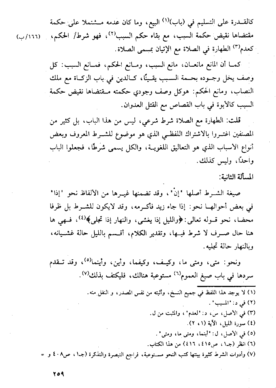قلت: الطهارة مع الصلاة شرط شرعي, ليس من هذا الباب, بل كثير من المصنفين اغتروا بالاشتراك اللفظي الذي هو موضع للشرط المعروف وبعض أنواع الأسباب الذي هو التعاليق اللغوية, والكل يسمى شرطًا, فجعلوا الباب واحدًا, وليس كذلك.