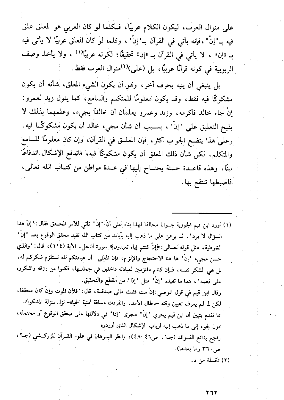 بل ينبغي أن ينبه بحرف آخر, وهو أن يكون الشيء المعلق, شأنه أن يكون مشكوكًا فيه فقط, وقد يكون معلومًا للمتكلم والسامع, كما يقول زيد لعمرو: إن جاء خالد فأكرمه, وزيد وعمرو يعلمان أن خالدًا يجيء, وعملهما بذلك لا يقبح التعليق على (إن) , بسبب أن شأن مجيء خالد أن يكون مشكوكًا فيه.
