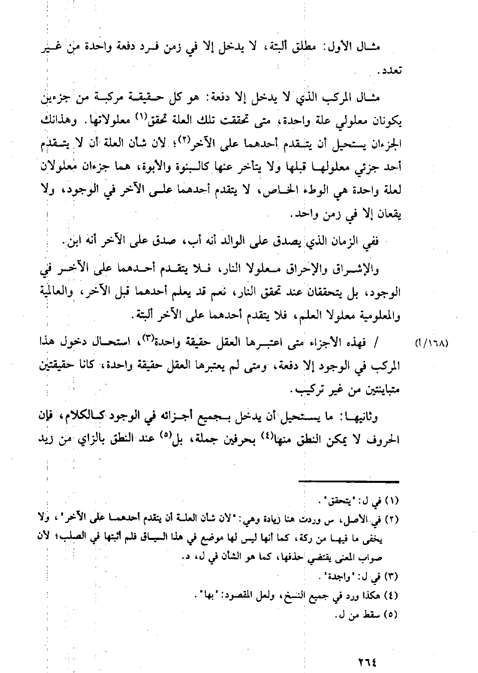 فهذه الأجزاء متى اعتبرها العقل حقيقة واحدة, استحال دخول هذا المركب في الوجود إلا دفعة, ومتى لم يعتبرها العقل حقيقة واحدة, كانا حقيقتين متباينتين من غير تركيب.