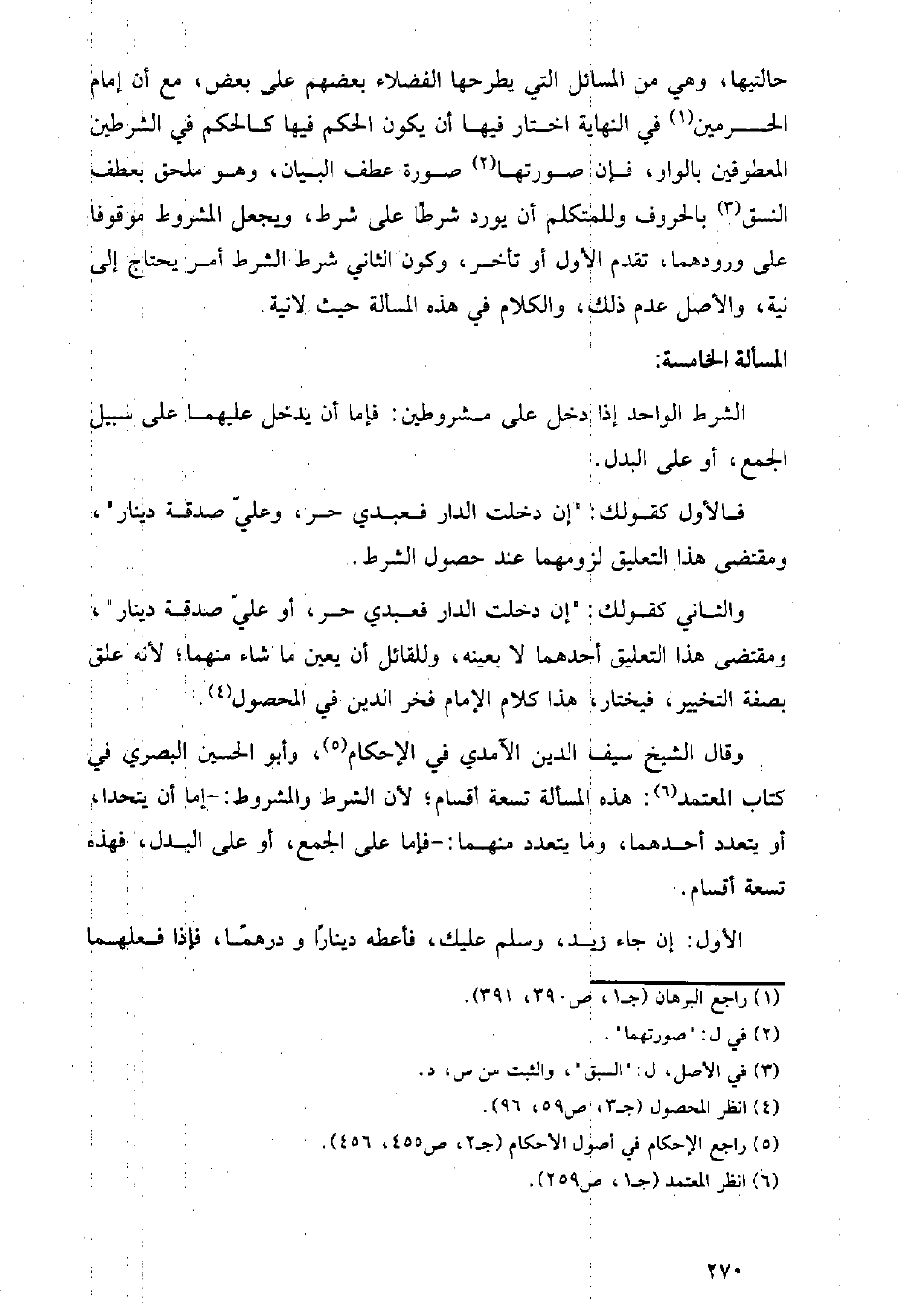 وقال الشيخ سيف الدين الآمدي في الإحكام, وأبو الحسين البصري في كتاب المعتمد: هذه المسألة تسعة أقسام؛ لأن الشرط والمشروط: - إما أن يتحدا, أو يتعدد أحدهما, وما يتعدد منهما: - فإما على الجمع, أو على البدل, فهذه تسعة أقسام.