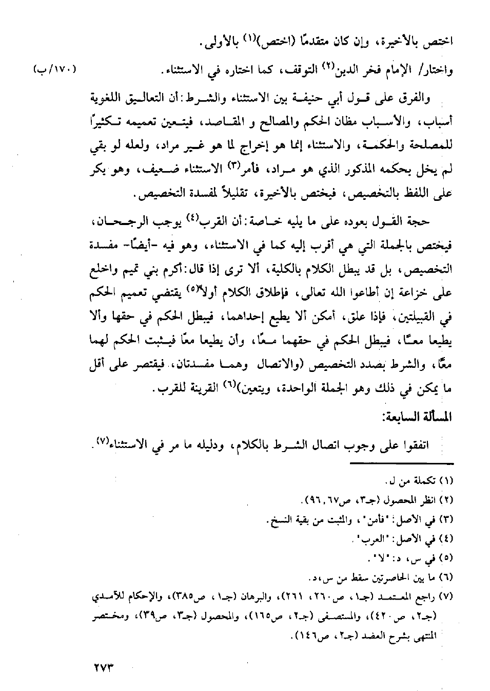 والفرق على قول أبي حنيفة بين الاستثناء والشرط: أن التعاليق اللغوية أسباب، والأسباب مظان الحكم والمصالح والمقاصد، فيتعين تعميمه تكثيرًا للمصلحة والحكمة، والاستثناء إنما هو إخراج لما هو غير مراد، ولعله لو بقي لم يخل بحكمه المذكور الذي هو مراد، فأمر الاستثناء ضعيف، وهو يكر على اللفظ بالتخصيص، فيختص بالأخيرة، تقليلًا لمفسدة التخصيص.