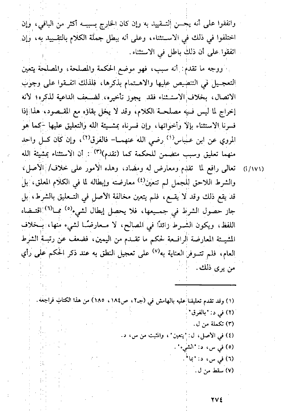 ووجه ما تقدم: أنه سبب، فهو موضع الحكمة والمصلحة، والمصلحة يتعين التعجيل في التنصيص عليها والاهتمام بذكرها، فلذلك اتفقوا على وجوب الاتصال، بخلاف الاستثناء فقد يجوز تأخيره، لضعف الداعية لذكره؛ لأنه إخراج لما ليس فيه مصلحة الكلام، وقد لا يخل بقاؤه مع المقصود، هذا إذا فسرنا الاستثناء بإلا وأخواتها، وإن فسرناه بمشيئة الله والتعليق عليها- كما هو المروي عن ابن عباس رضي الله عنهما- فالفرق، وإن كان كل واحد منهما تعليق وسبب متضمن للحكمة كما (تقدم): أن الاستثناء بمشيئة الله تعالى رافع لما تقدم ومعارض له ومضاد، وهذه الأمور على خلاف الأصل، والشرط اللاحق للجمل لم تتعين مخالفة الأصل في التعليق بالشرط، بل جاز حصول الشرط في جميعها، فلا يحصل إبطال لشيء مما اقتضاه اللفظ، ويكون الشرط زائدًا في المصالح، لا معارضًا لشيء منها، بخلاف المشيئة المعارضة الرافعة لحكم ما تقدم من اليمين، فضعف عن رتبة الشرط العام، فلم تتوفر العناية به على تعجيل النطق به عند ذكر الحكم على رأي من يرى ذلك.
