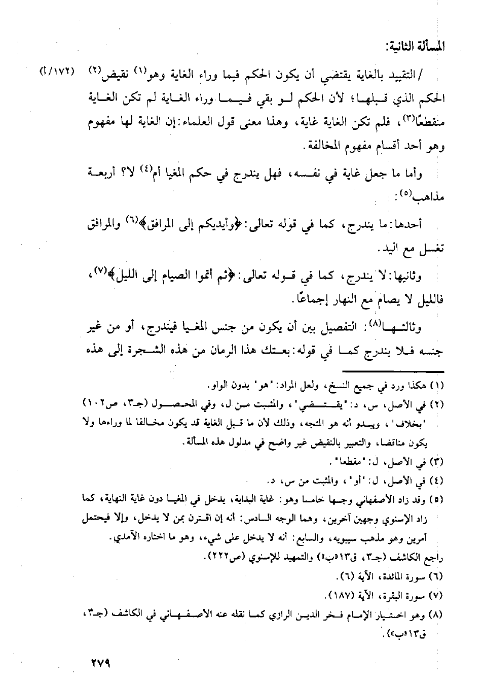 التقييد بالغاية يقتضي أن يكون الحكم فيما وراء الغاية وهو نقيض الحكم الذي قبلها؛ لأن الحكم لو بقي فيما وراء الغاية لم تكن الغاية منقطعًا، فلم تكن الغاية غاية، وهذا معنى قول العلماء: إن الغاية لها مفهوم وهو أحد أقسام مفهوم المخالفة.
