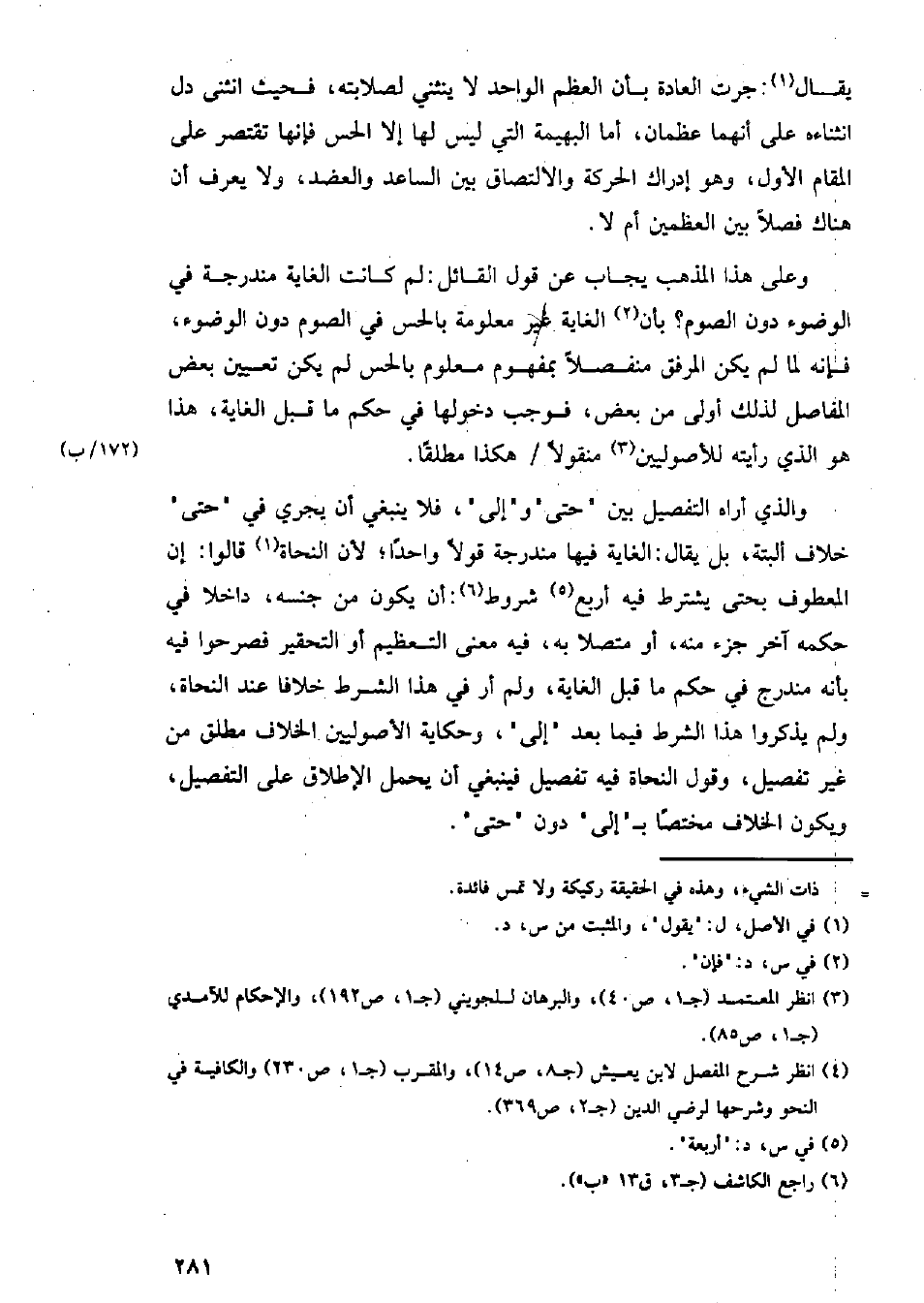 والذي أراه التفصيل بين (حتى) و (إلى)، فلا ينبغي أن يجري في (حتى) خلاف البتة، بل يقال: الغاية فيها مندرجة قولًا واحدًا؛ لأن النحاة قالوا: إن المعطوف بحتى يشترط فيه أربع شروط: أن يكون من جنسه، داخلا في حكمه آخر جزء منه، أو متصلا به، فيه معنى التعظيم أو التحقير فصرحوا فيه بأنه مندرج في حكم ما قبل الغاية، ولم أر في هذا الشرط خلافا عند النحاة، ولم يذكروا هذا الشرط فيما بعد (إلى)، وحكاية الأصوليين الخلاف مطلق من غير تفصيل، وقول النحاة فيه تفصيل فينبغي أن يحمل الإطلاق على التفصيل، ويكون الخلاف مختصًا بـ (إلى) دون (حتى).