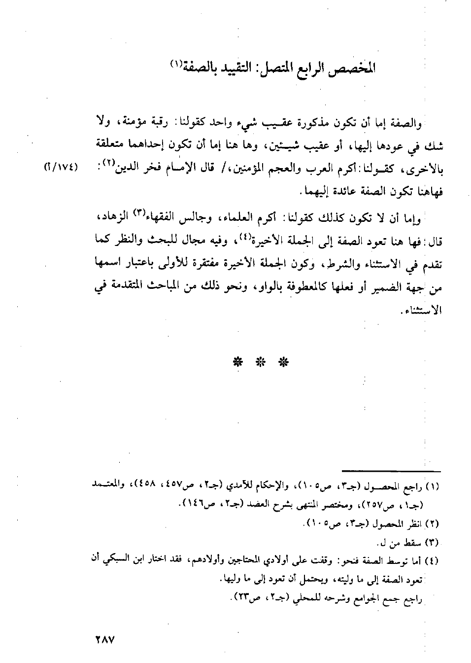 والصفة إما أن تكون مذكورة عقيب شيء واحد كقولنا: رقبة مؤمنة، ولا شك في عودها إليها، أو عقيب شيئين، وها هنا إما أن تكون إحداهما متعلقة بالأخرى، كقولنا: أكرم العرب والعجم المؤمنين، قال الإمام فخر الدين: فهاهنا تكون الصفة عائدة إليهما.